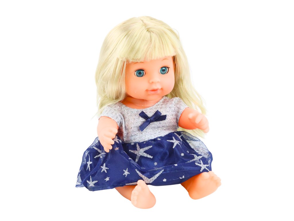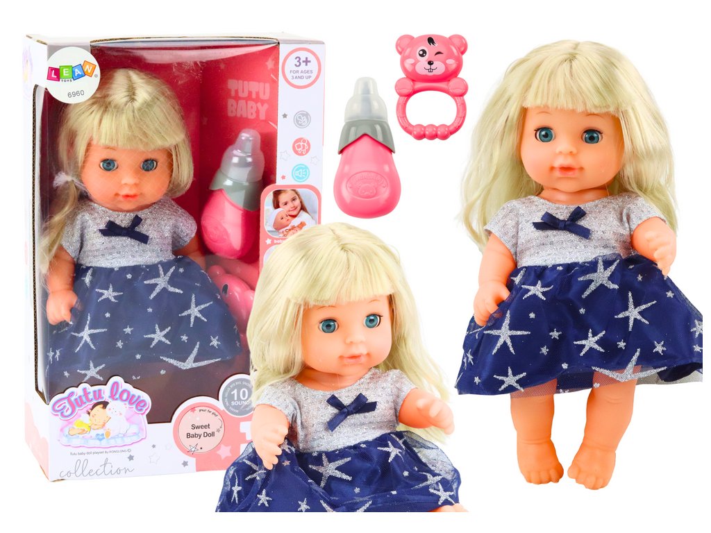 Păpușă într-o rochie albastru închis, cu o sticlă, zdrăngănit și sunete de pipi