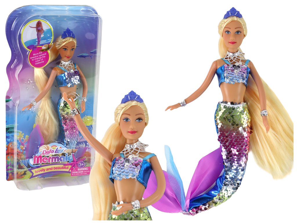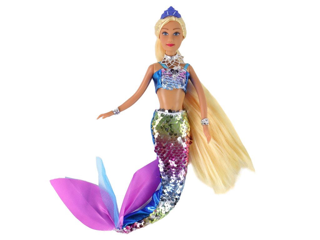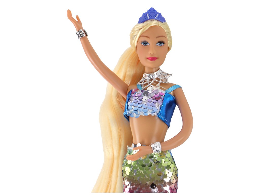 Păpușă sirenă cu păr lung și blond și o coadă albastră strălucitoare