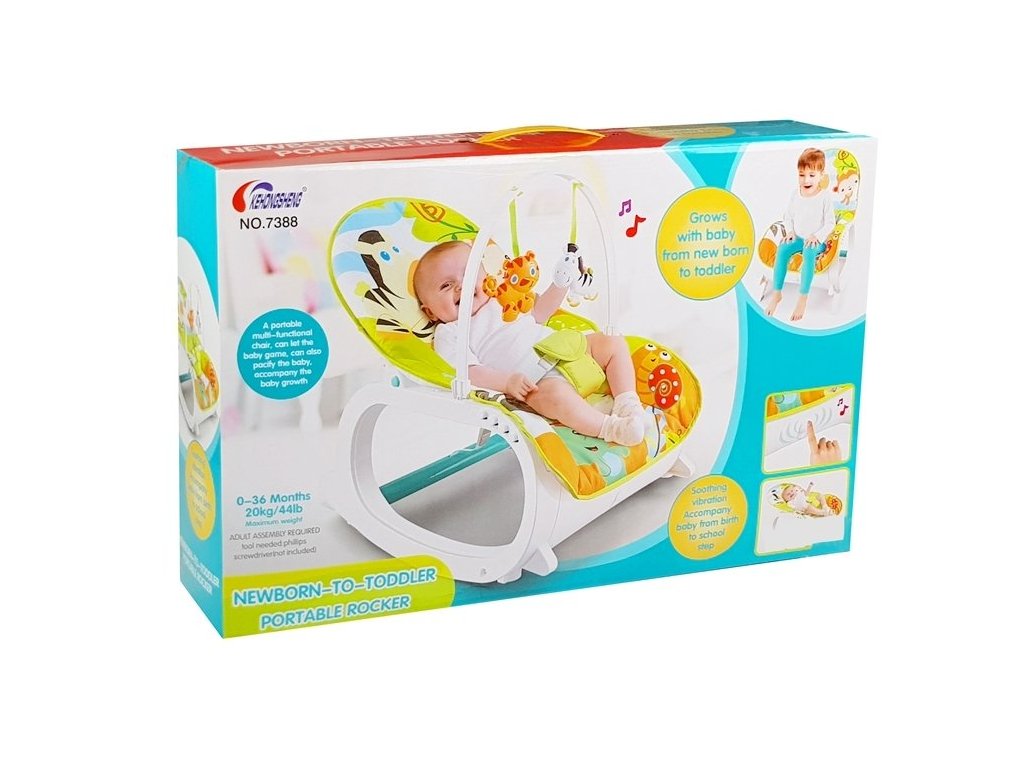 Componentele sezlongului sunt curele care asigura siguranta copilului si un trapez detasabil cu jucarii agatate care cu siguranta vor atrage atentia copilului. Un mare avantaj este că husa șezlongului este realizată din material care poate fi spălat în mașina de spălat. Patutul este alimentat de 3 baterii AA 1.5V, care nu sunt incluse in set.
