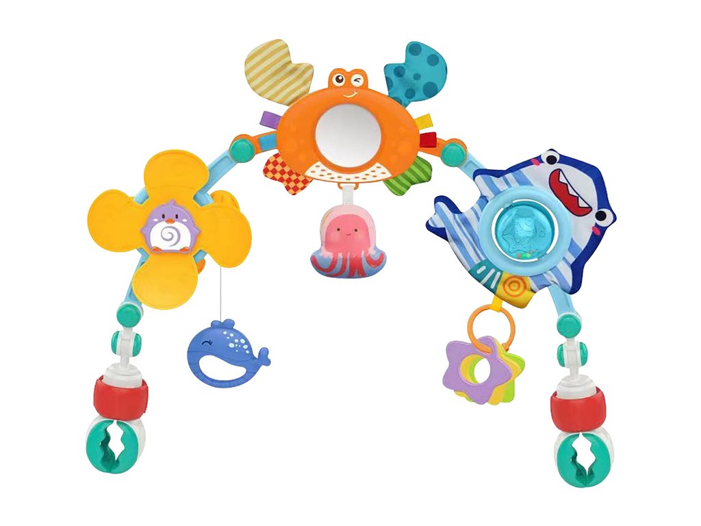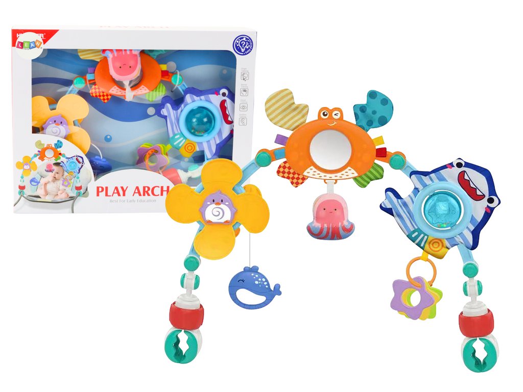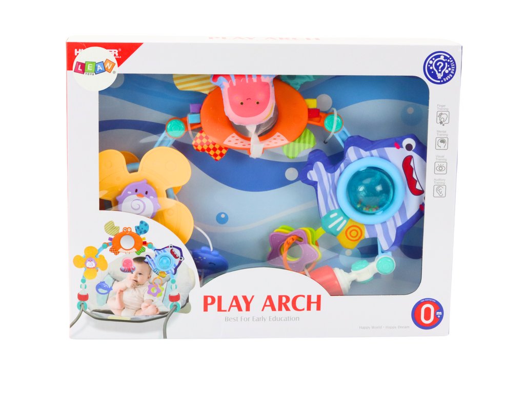 Arcul de joacă pentru pătuț este un accesoriu unic care dezvoltă simțurile și abilitățile bebelușului tău. Conține trei elemente principale: o moară de vânt cu un pinguin, un crab foșnind cu o oglindă și un rechin cu zdrăngănitor, care stimulează vederea, auzul și atingerea.
