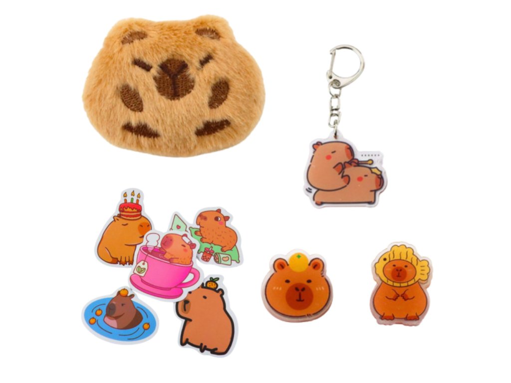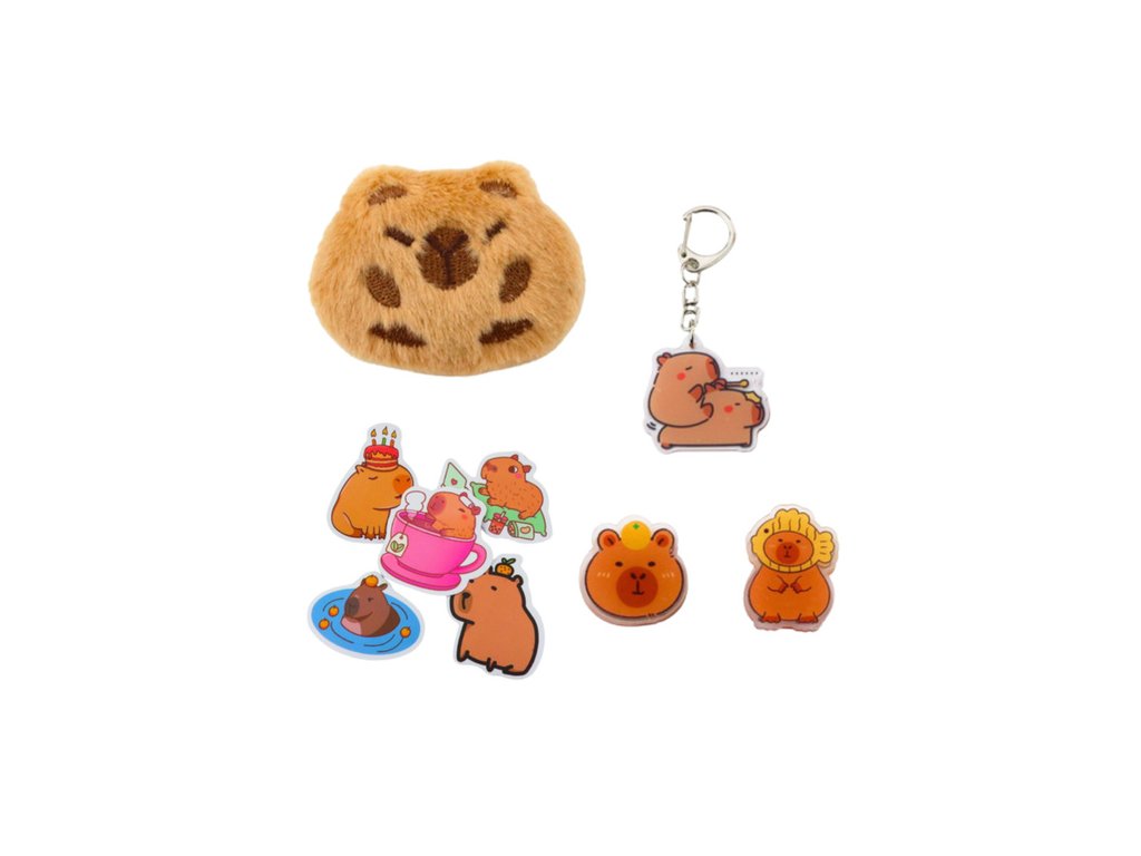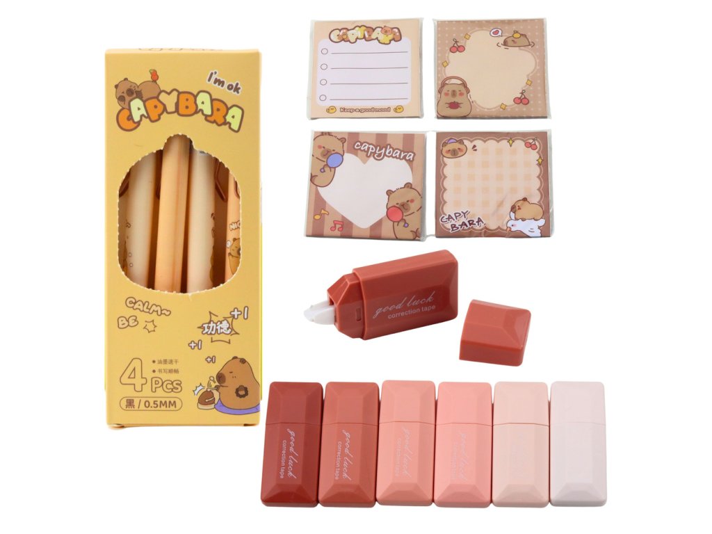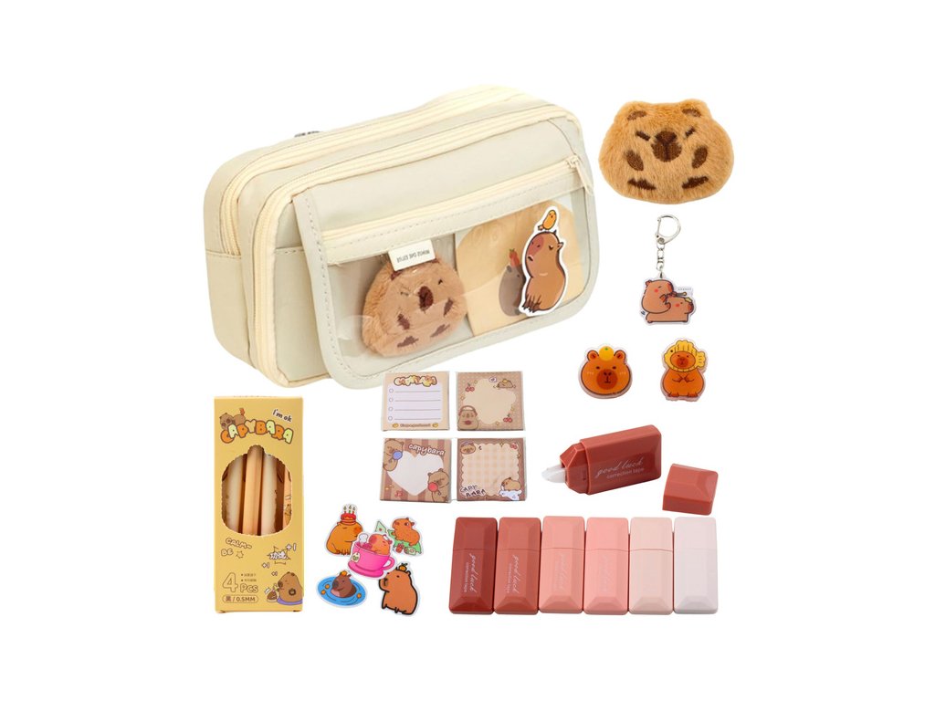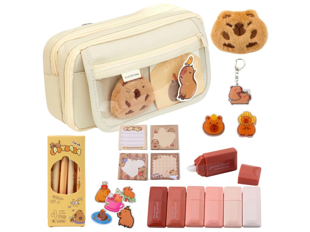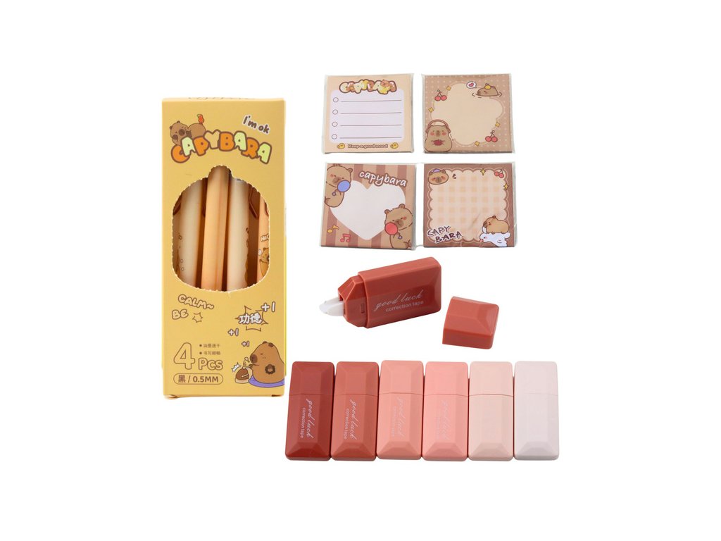 Pachetul include un set bogat de accesorii cu tematică capibara, inclusiv: 4 pixuri cu cerneală neagră, 6 corectoare în formă de șoarece, 4 seturi de bilețele autoadezive decorative, o capibara de pluș cu ac de siguranță, un breloc în formă de capibara, 2 cleme în formă de capibara și 5 stickere distractive. Acesta este cadoul perfect pentru un student, un iubitor de animale sau oricine căruia îi plac instrumentele de învățare unice.