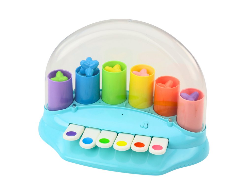 Fiecare tastă a tastaturii produce un sunet melodios în timp ce activează mecanismul pop-up star. Când copilul apasă tasta, stelele zboară în jurul domului transparent și creează un spectacol spectaculos. Cupola direcționează apoi stelele căzătoare pe o cale specială, astfel încât de fiecare dată când copilul cântă o altă notă, stele noi umple spațiul.