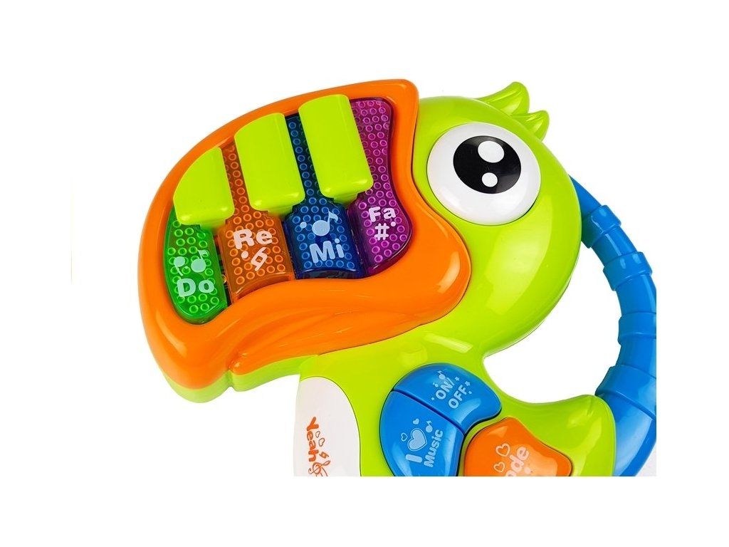 Dezvoltarea corectă și zâmbetul pe buze sunt foarte importante în viața fiecărui copil. Funcțiile diferite ale pianului pentru bebeluși , precum și culorile și modelele sale, îl vor face pe copil să înceapă să distingă și să învețe noi sunete, culori și forme încă de la o vârstă fragedă. Cântarea la pian va afecta pozitiv auzul și vederea copilului dumneavoastră și îi va stimula imaginația. Pianul în formă de papagal colorat va încânta fiecare copil, are butoane muzicale iar distracția este însoțită de luminile strălucitoare ale butoanelor „DO”, „RE” și „MI”. Jucăria este pornită cu butonul ON / OFF. Alături de acesta se află butonul „MODE”, care schimbă modurile sunetelor pianului. Apăsați tastele pentru a asculta melodii vesele, sunete de animale sau sunete standard de pian și cântați propria melodie.