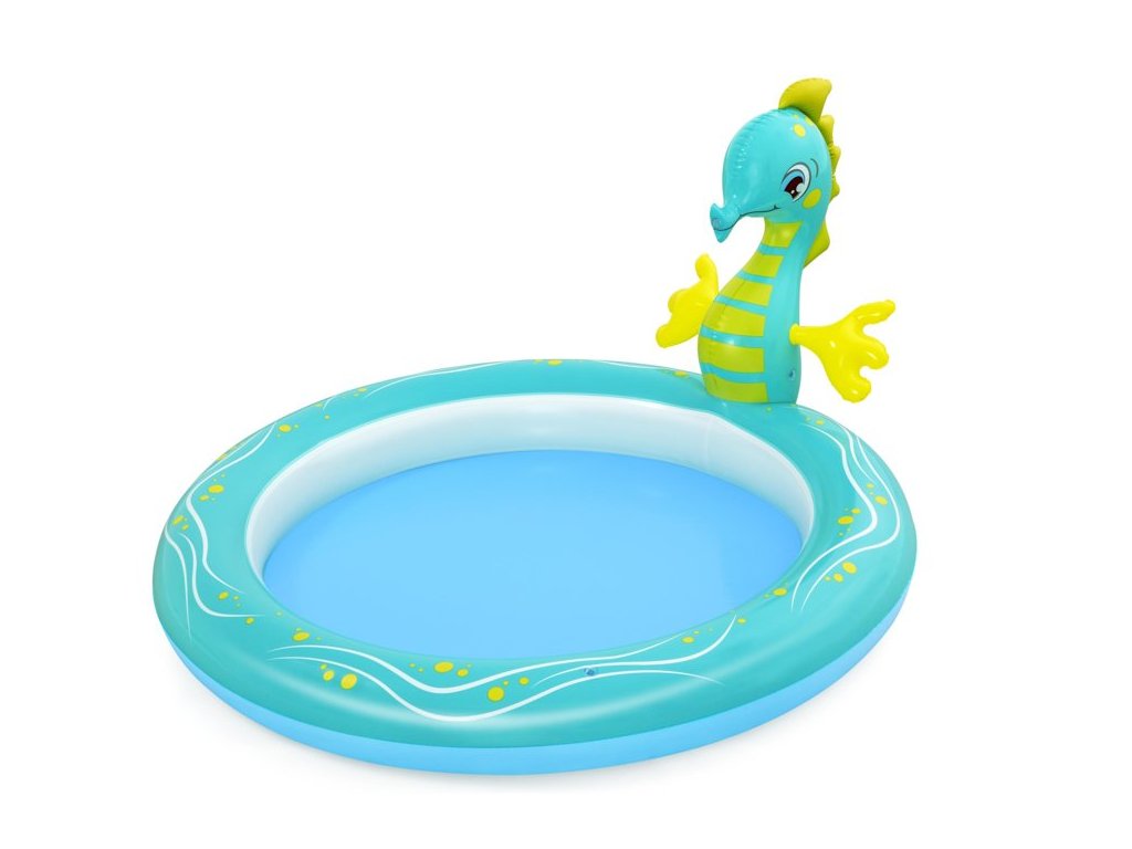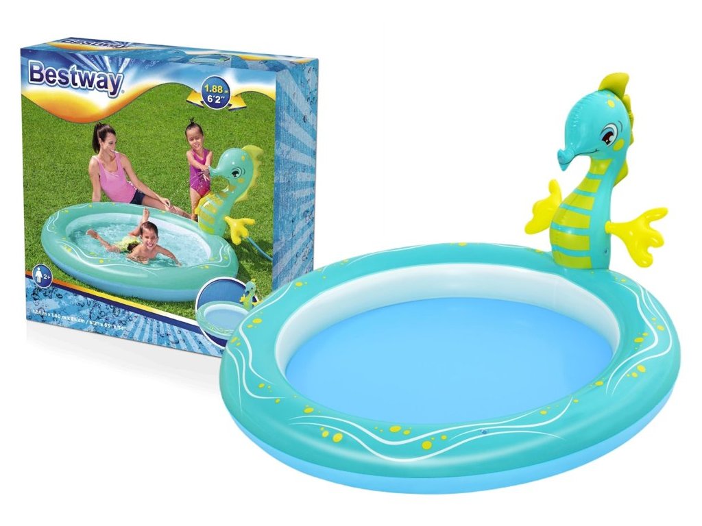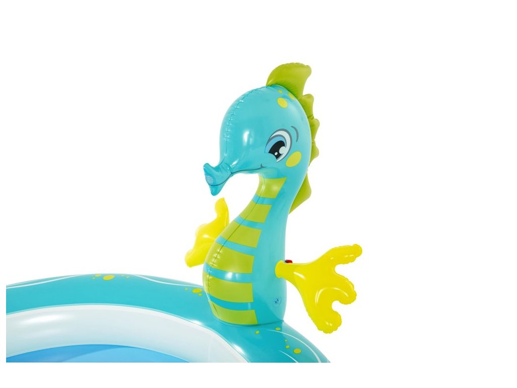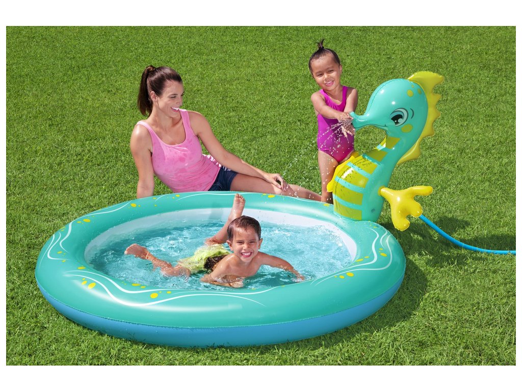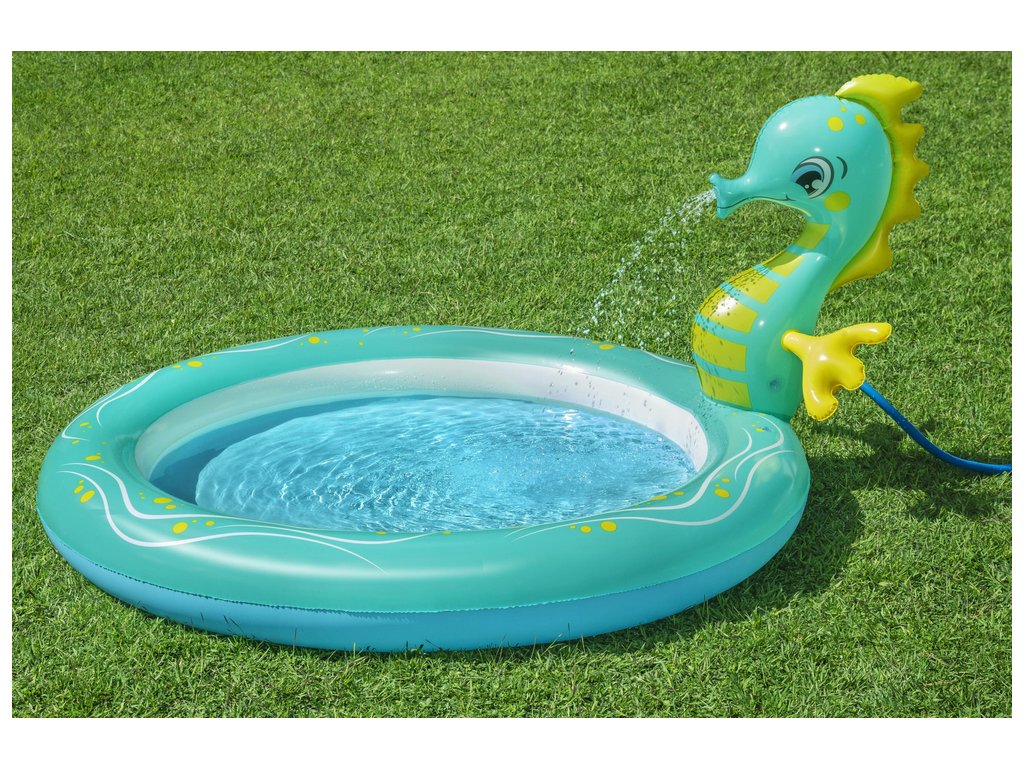 Piscina este realizată din material moale, dar durabil și este extrem de sigură pentru cei mai mici copii. Atractia principala este un cal de mare, din care curge apa dupa conectarea unui furtun de gradina.