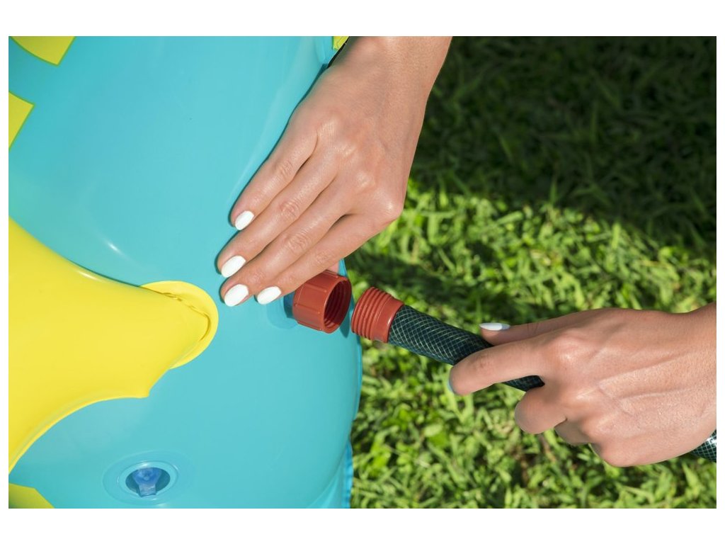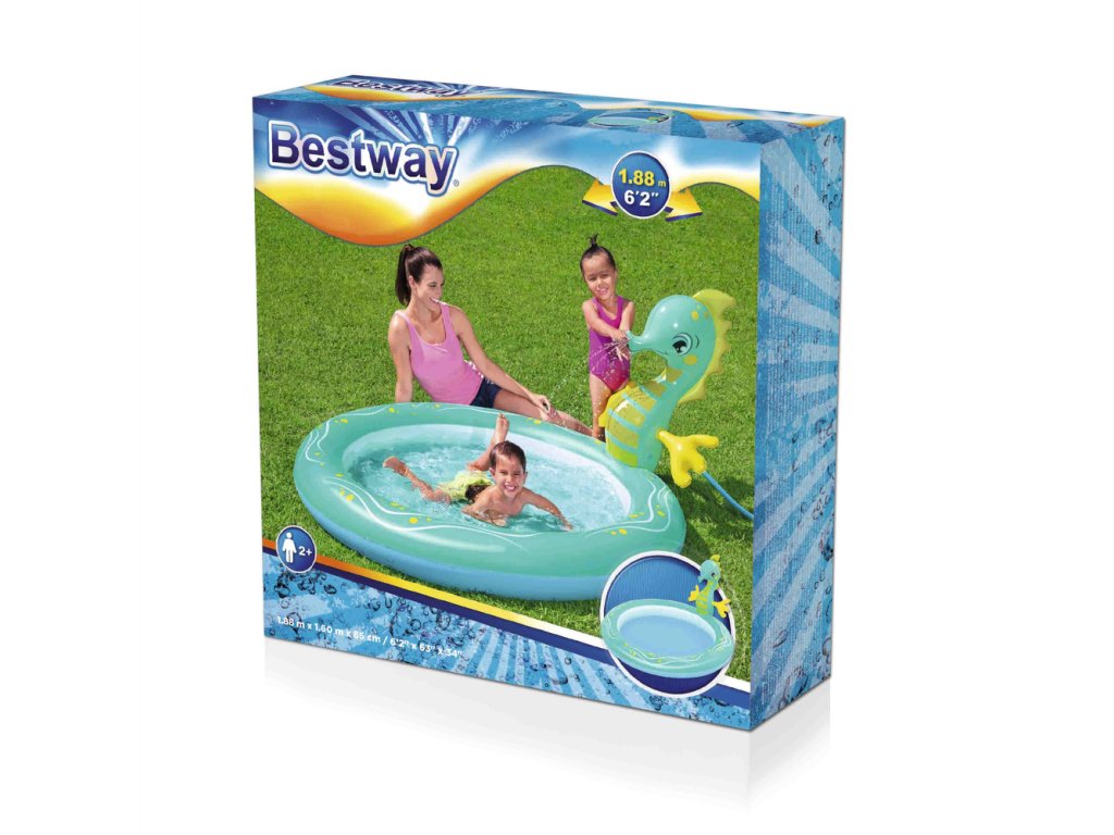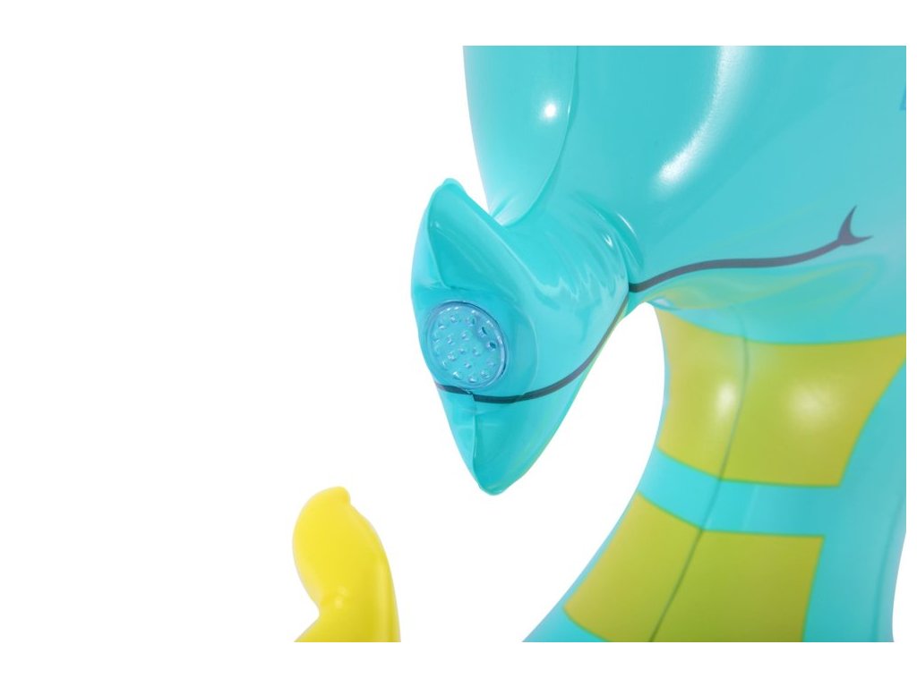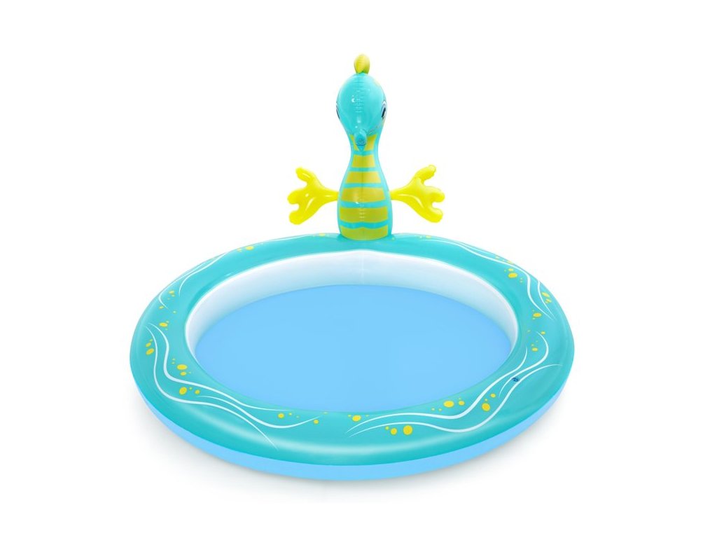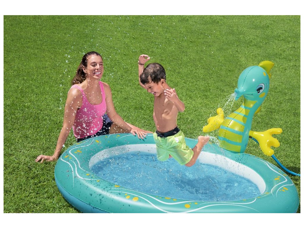 Piscina este realizată din material moale, dar durabil și este extrem de sigură pentru cei mai mici copii. Atractia principala este un cal de mare, din care curge apa dupa conectarea unui furtun de gradina.