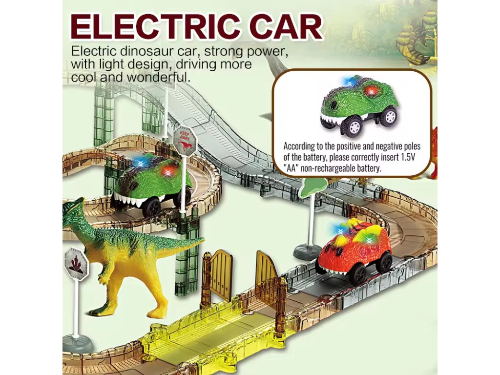 Pătrunde într-o lume preistorică cu pista de curse cu dinozauri, care oferă aventuri nesfârșite. Construiește-ți propria pistă cu poduri, curbe și tuneluri, eliberează mașinuța electrică și urmărește cum aleargă printre dinozauri. Setul include figurine de dinozauri, indicatoare rutiere și alte accesorii, făcând jocul și mai realist și distractiv.