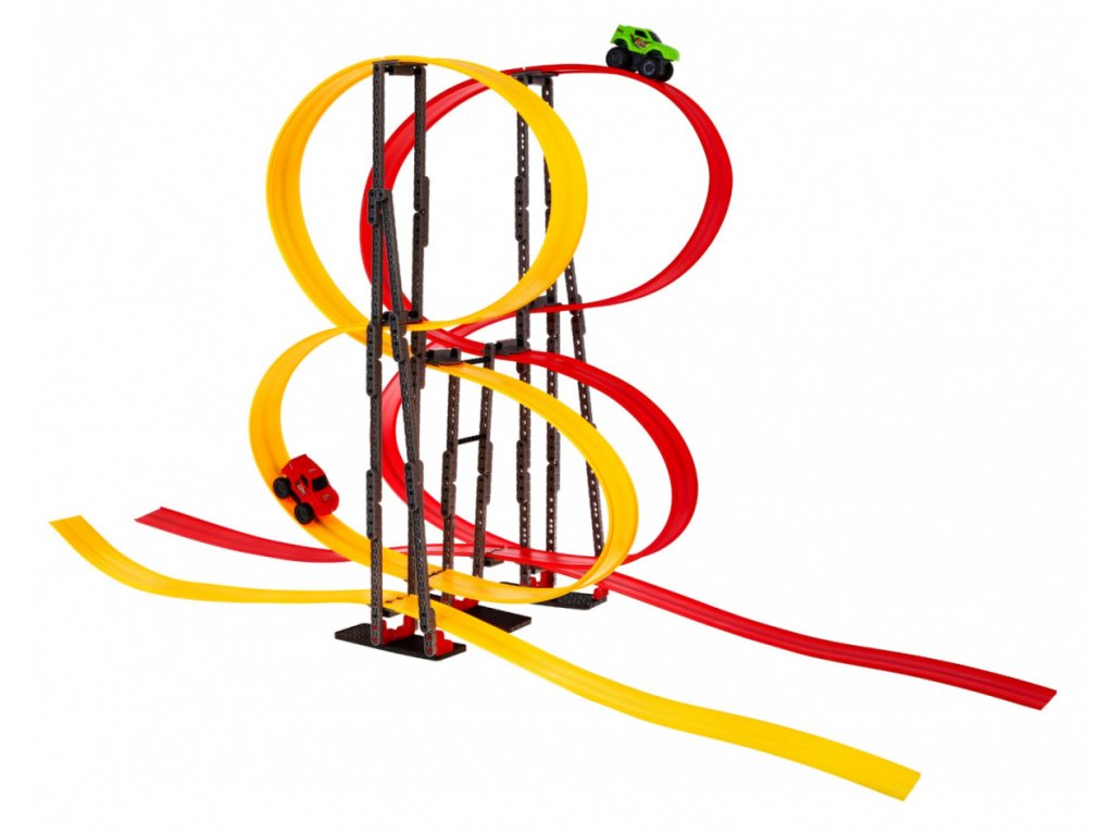 Pista de curse cu două mașini și bucle. Sina auto este ușor de asamblat, nu ocupă mult spațiu și este ușor de operat. Doi oameni se pot juca cu mașinile în același timp. Mașinile au tracțiune față și spate și magneți puternici care le mențin ferm pe pistă.