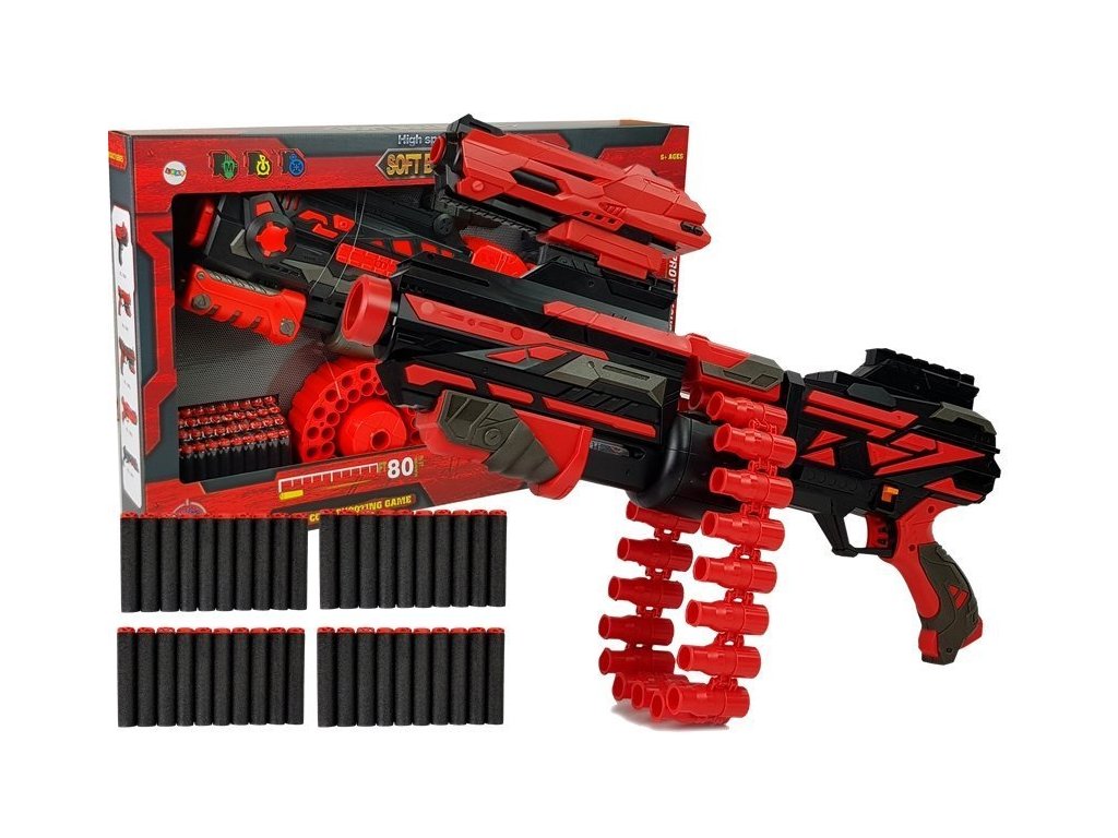 Pistolul-mitralieră are un magazin lung care poate ține cu ușurință până la 40 de cartușe. Raza de acțiune a proiectilului este mare, până la 45 m! Designul său seamănă cu un pistol adevărat, dar este sigur, fără capete ascuțite. Vizorul montat pe partea superioară a armei vă permite să vizați mai precis ținta. Pentru a trage, doar trageți de mâner, încărcați și trageți!