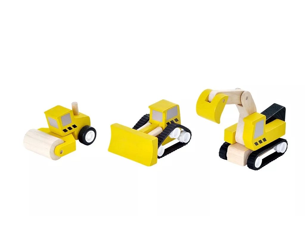 Set de trei mașini de construcție din lemn, potrivite pentru un joc tematic de construire a drumurilor. Mașinile sunt compatibile cu pista de curse, ceea ce permite extinderea scenariilor de joc și sprijină imaginația copiilor și interacțiunile sociale.