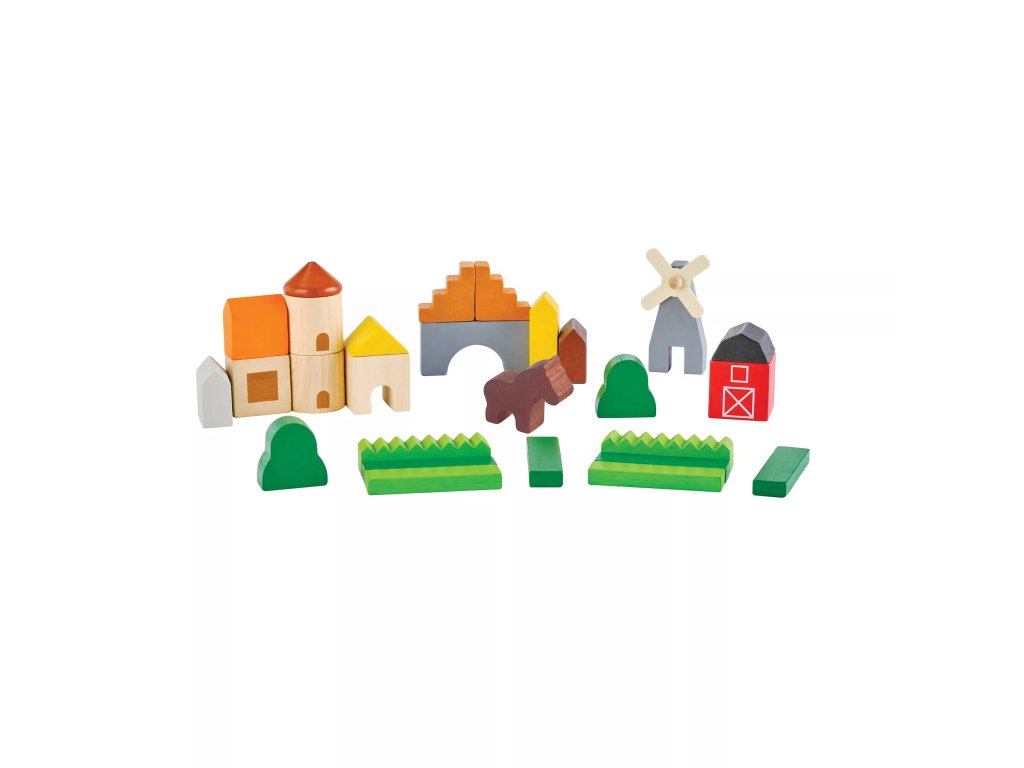 Mutați-vă la țară și construiți-vă ferma după propria imaginație. Setul de construcție din lemn sprijină jocul imaginativ, motricitatea fină, concentrarea și coordonarea copiilor.