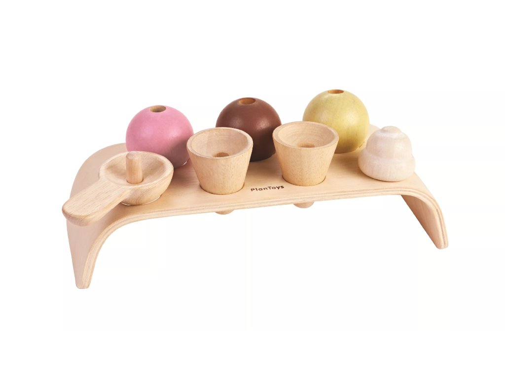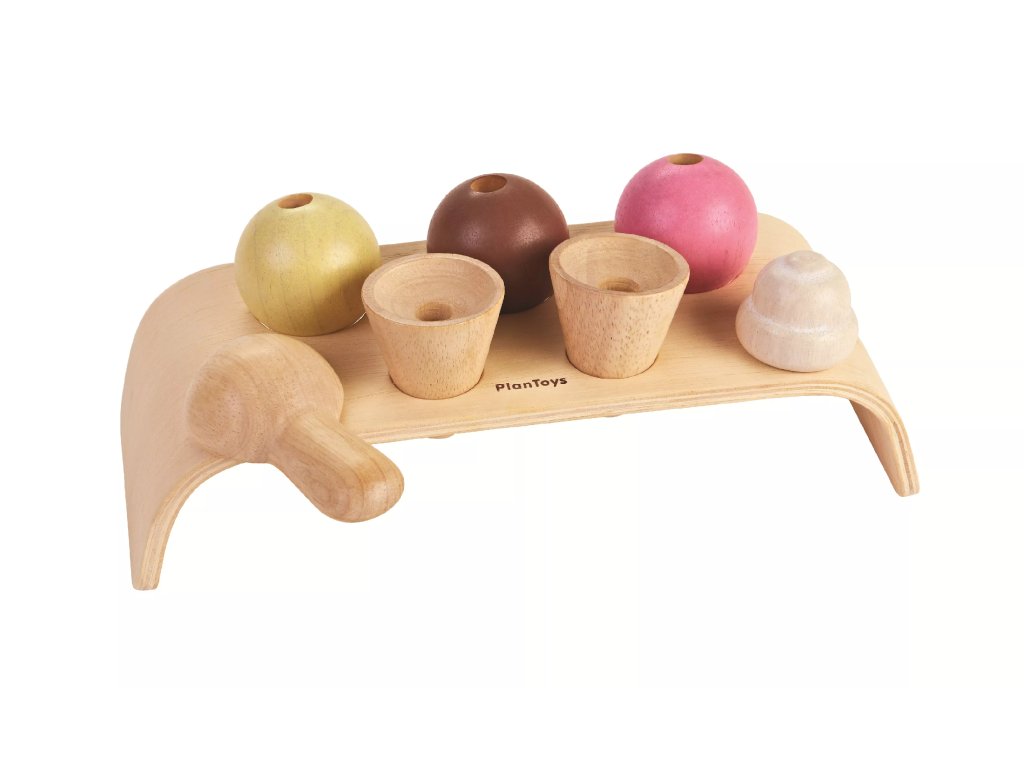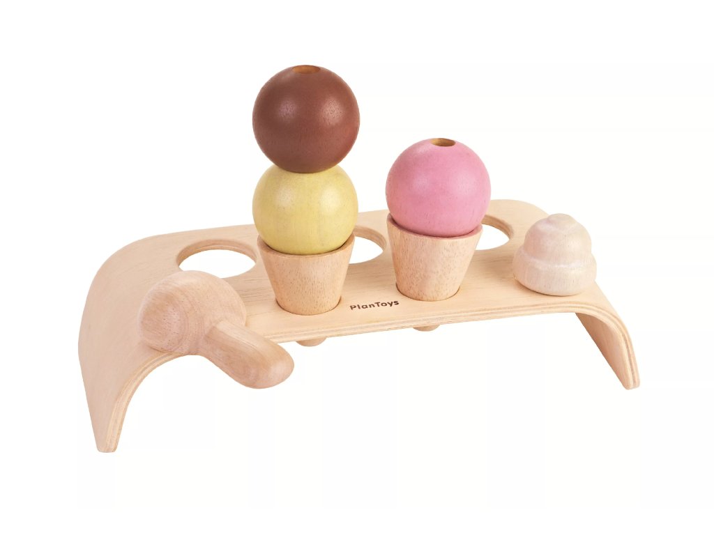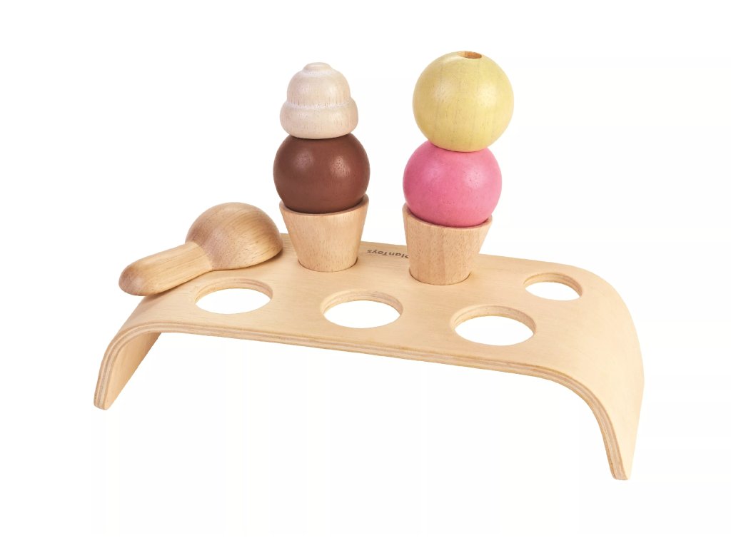Suportul provine din atelierul companiei Plan Toys. Setul este conceput pentru a exersa imaginația și permite copiilor să asambleze părți individuale de înghețată în cornete sau pe o tavă.