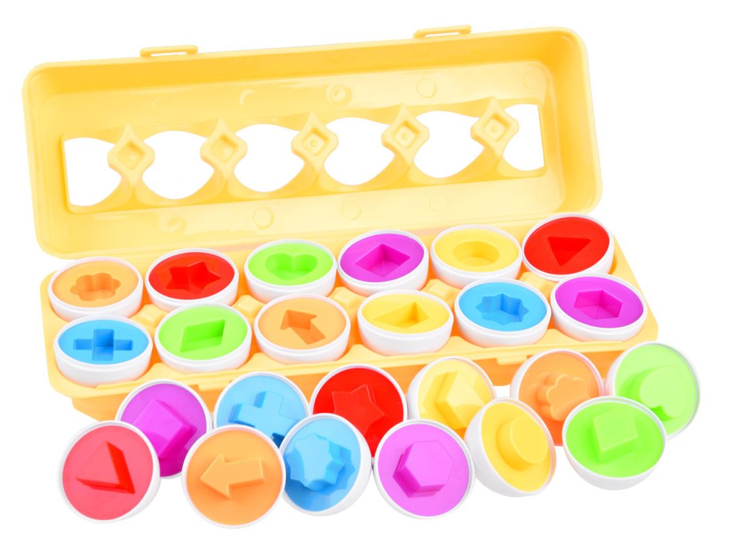 Ouăle colorate din extrudare sunt o jucărie grozavă pentru cei mici, care va oferi ore de distracție creativă excelentă. În interiorul ouălor, în loc de gălbenușuri, găsim 6 culori (galben, portocaliu, roșu, verde, roz, albastru) și în plus, fiecare ou are o formă diferită (stea, inimă, cerc, pătrat). Jocul constă în potrivirea celor două jumătăți de formă și culoare astfel încât oul să fie combinat într-un întreg.