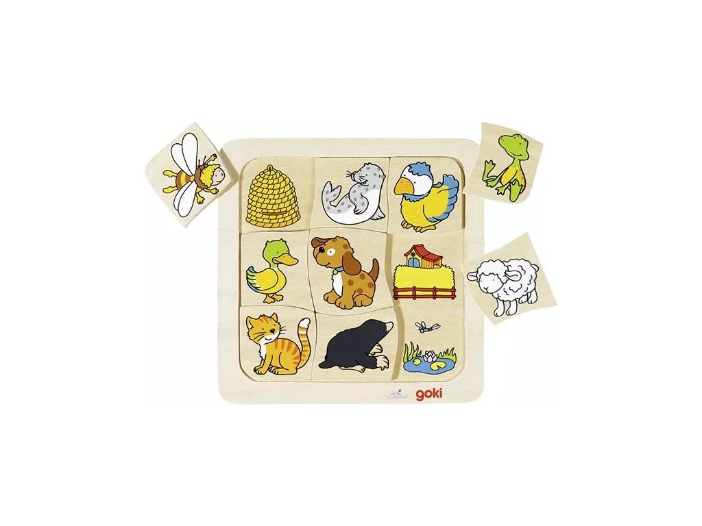 Puzzle din lemn de calitate, cu 9 piese, așezat pe o placă, destinat copiilor mici. Puzzle-ul combină manipularea ușoară cu recunoașterea animalelor și învățarea prin povești.