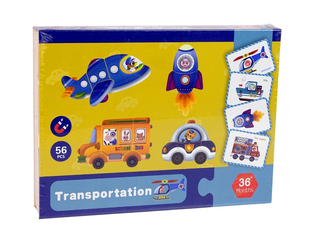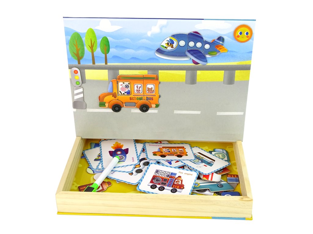 Setul conține cartonașe cu imagini ale personajelor individuale, sarcina copilului mic este să asambleze elementele magnetice ale mijlocului de transport conform șablonului în așa fel încât să reproducă complet imaginea dată. Puzzle-urile vor servi copilului mult timp, datorită posibilității de a crea diverse imagini creative. Pixul vă permite să adăugați sau să desenați pe propriile elemente. Trezește sensibilitatea artistică a copilului și antrenează gândirea logică.