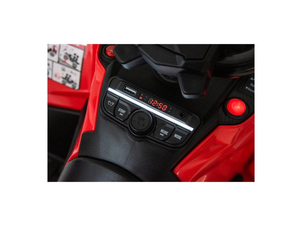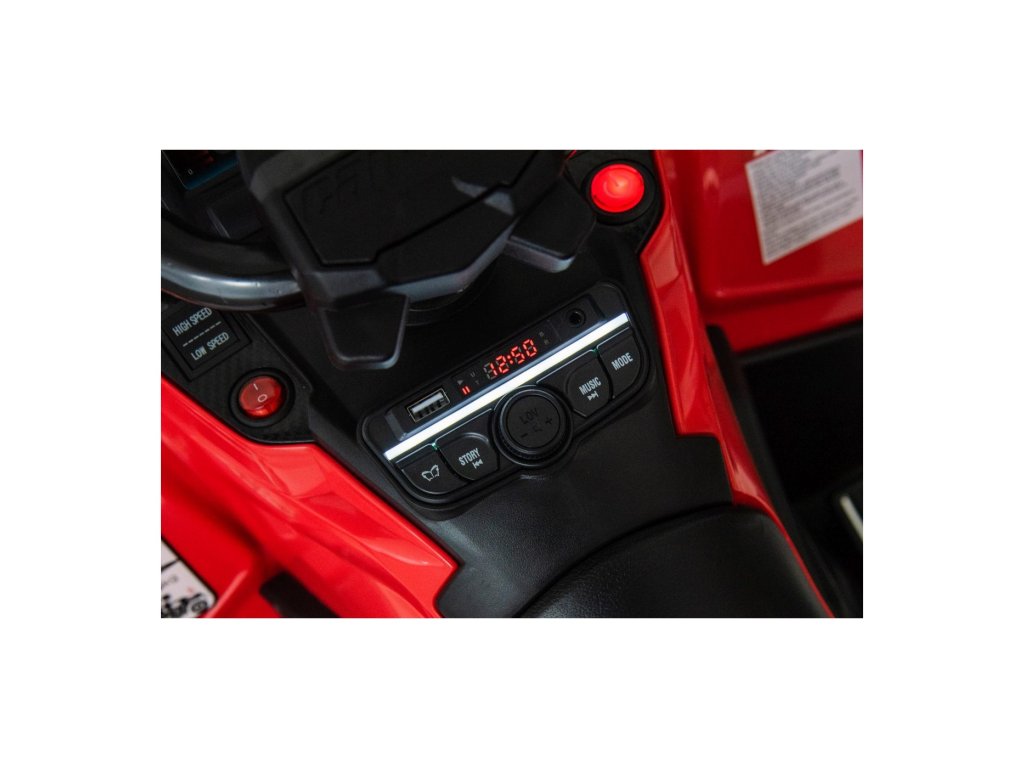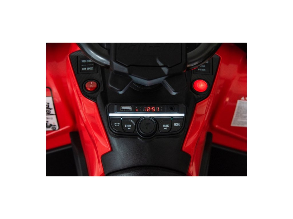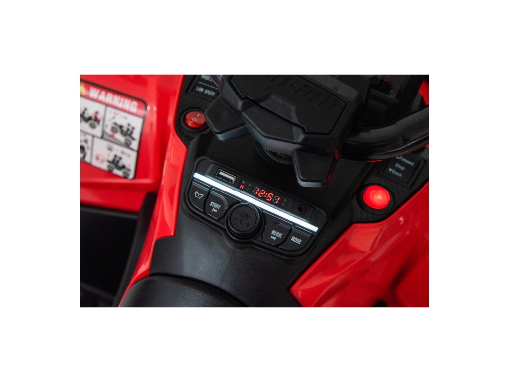 Echipamentul include un panou muzical cu intrări USB, MP3, Radio, AUX, Bluetooth și melodii preînregistrate. ATV-ul are lumini față și spate, permite conducerea în toate direcțiile și are o capacitate de încărcare de până la 50 kg .