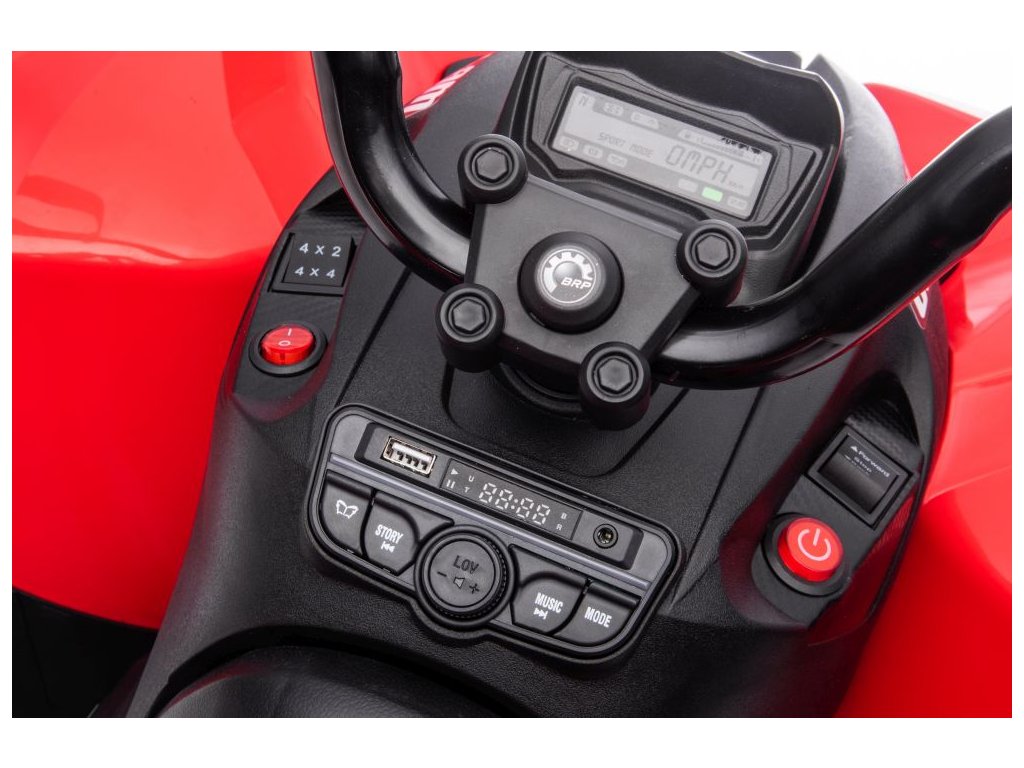 Echipamentul include un panou muzical cu intrări USB, MP3, radio și Bluetooth . Vehiculul cu patru roți Can-Am are lumini față și spate, permite conducerea în toate direcțiile și are o capacitate de încărcare de până la 30 kg .