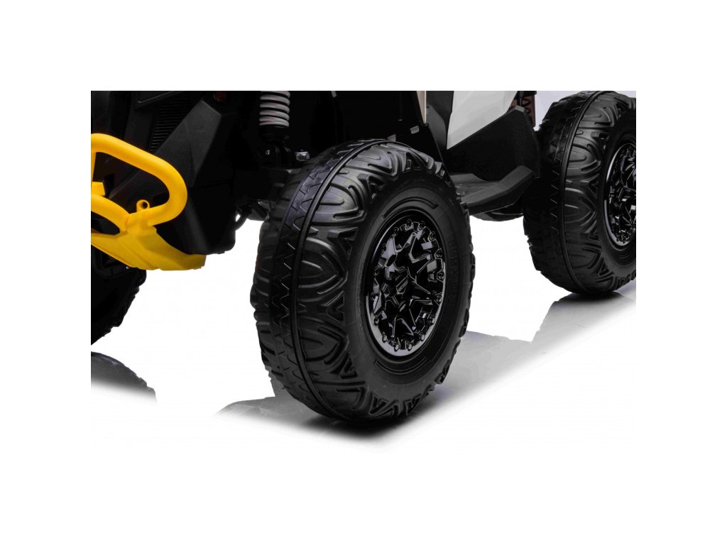 Vehiculul electric cu patru roți pentru copii este echipat cu două motoare cu o putere totală de 400 W și roți largi din spumă EVA . Quad-bike-ul se descurcă cu ușurință diferite tipuri de teren, suprafețe neasfaltate și dealuri.