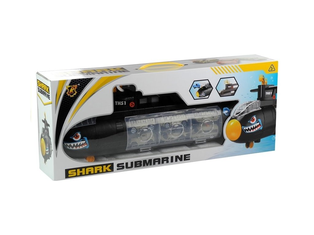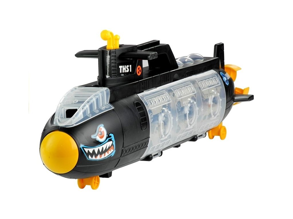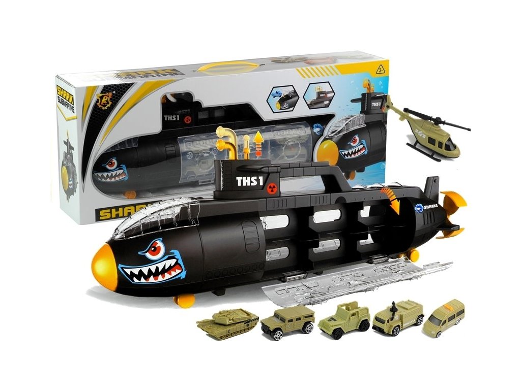 Un submarin mare care arată ca un rechin periculos ascunde un număr mare de elemente interesante în interiorul său. Ce se întâmplă? Mașini de diferite tipuri și elicoptere! Un submarin cu sortator cu două fețe va fi un cadou senzațional pentru un copil care iubește vehiculele și mașinile subacvatice.