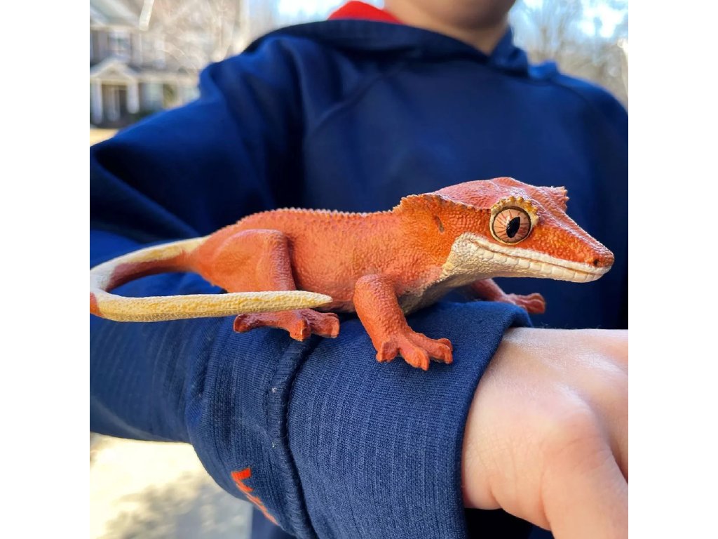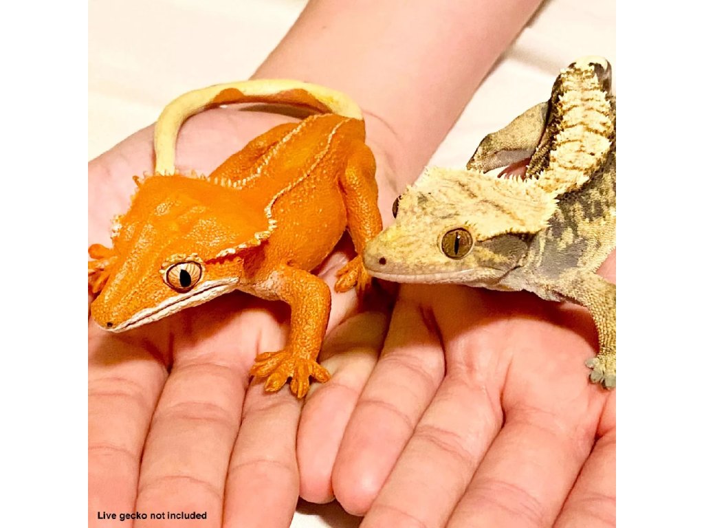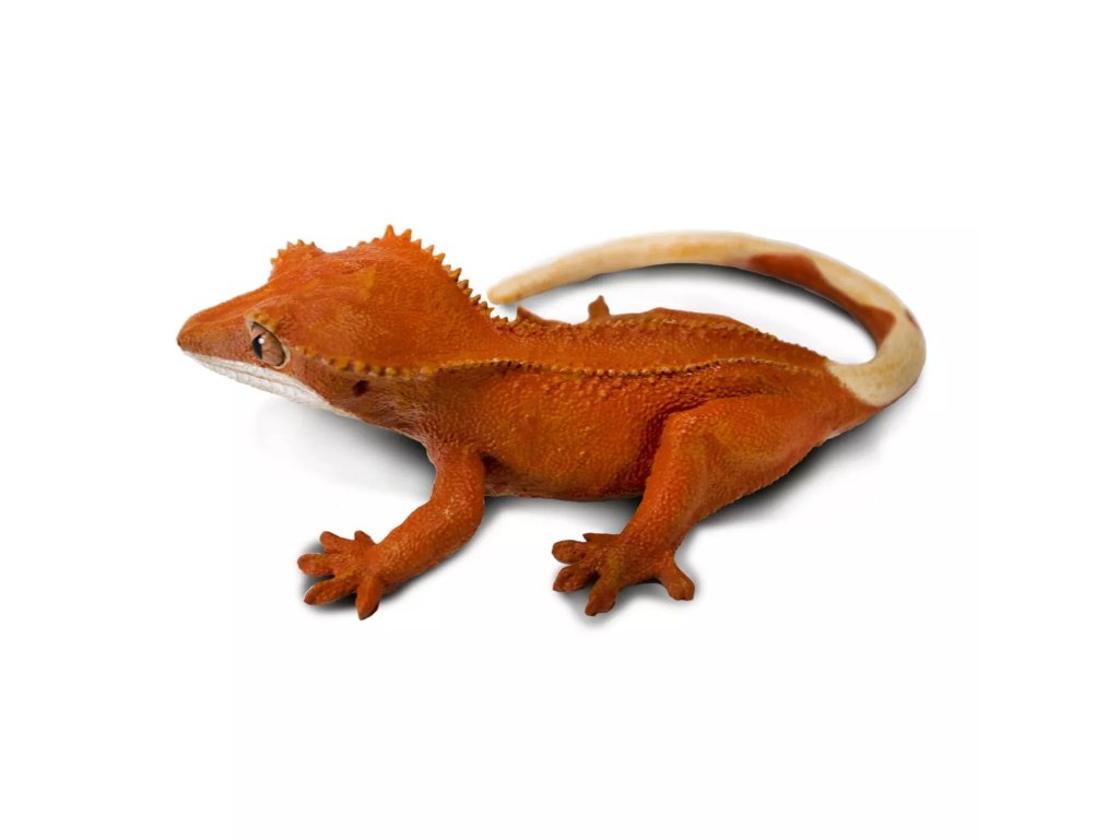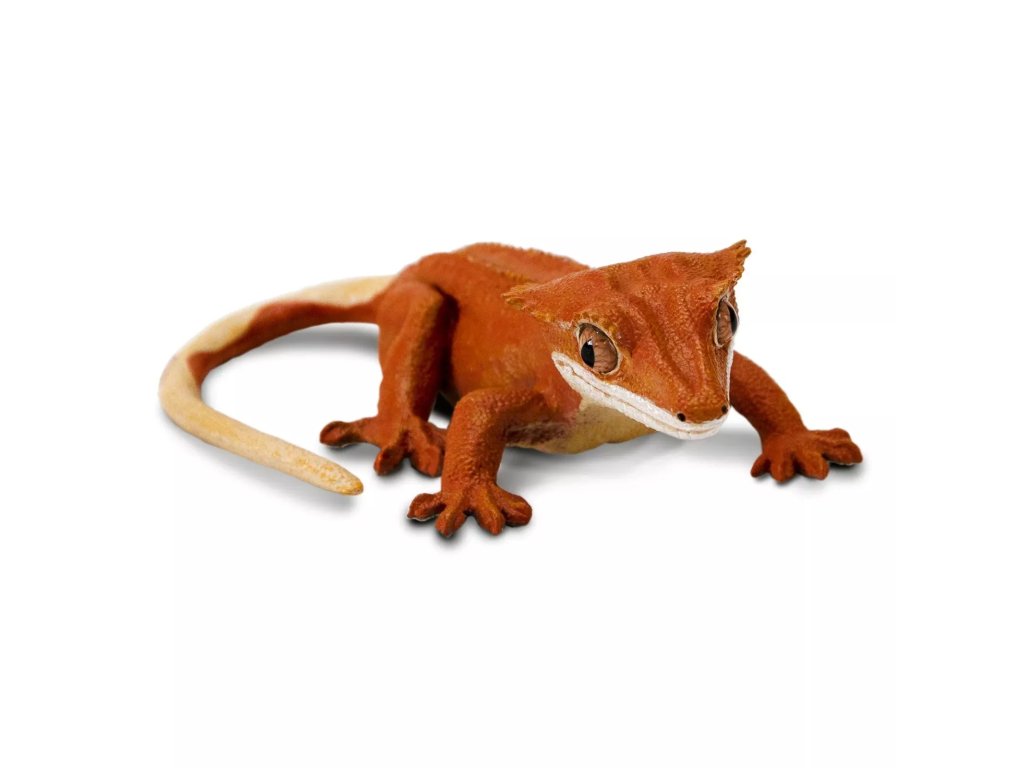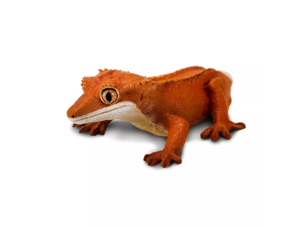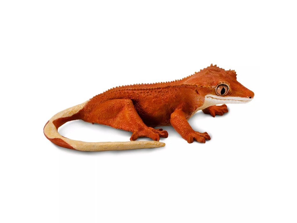 Figurină realistă a unui gecko cu creastă la scara 1:1, corespunzătoare dimensiunii unui animal real. Figurina se caracterizează printr-un cap cuneiform cu țepi scurți pe ambele părți și o culoare tipică.