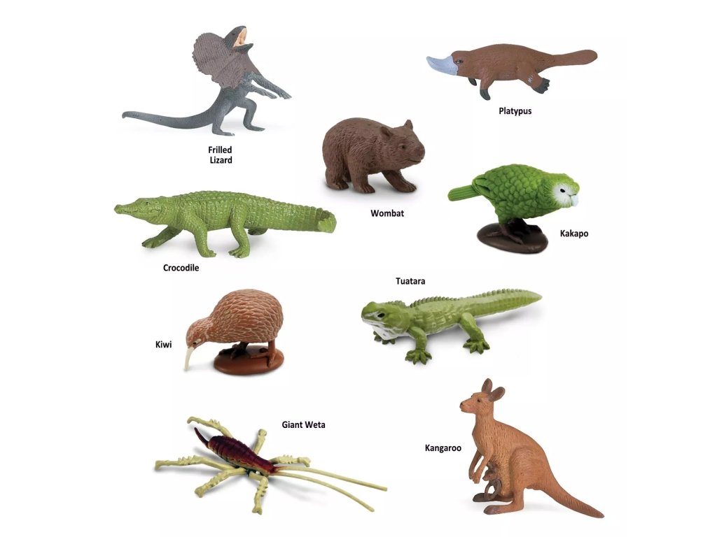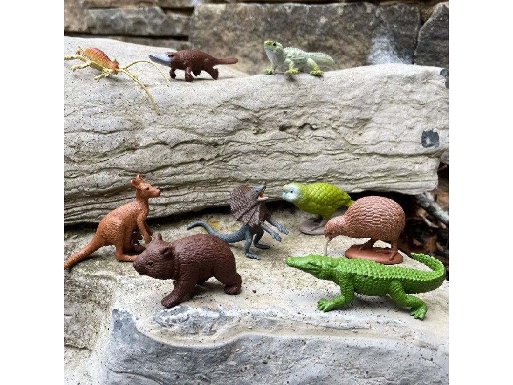 Datorită izolării de alte continente, continentul australian găzduiește multe animale unice. Acest set de figurine include specii selectate din Australia și Noua Zeelandă, care pot fi folosite în jocuri și activități educaționale.
