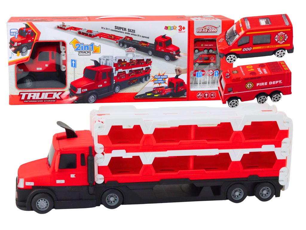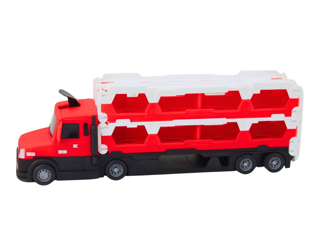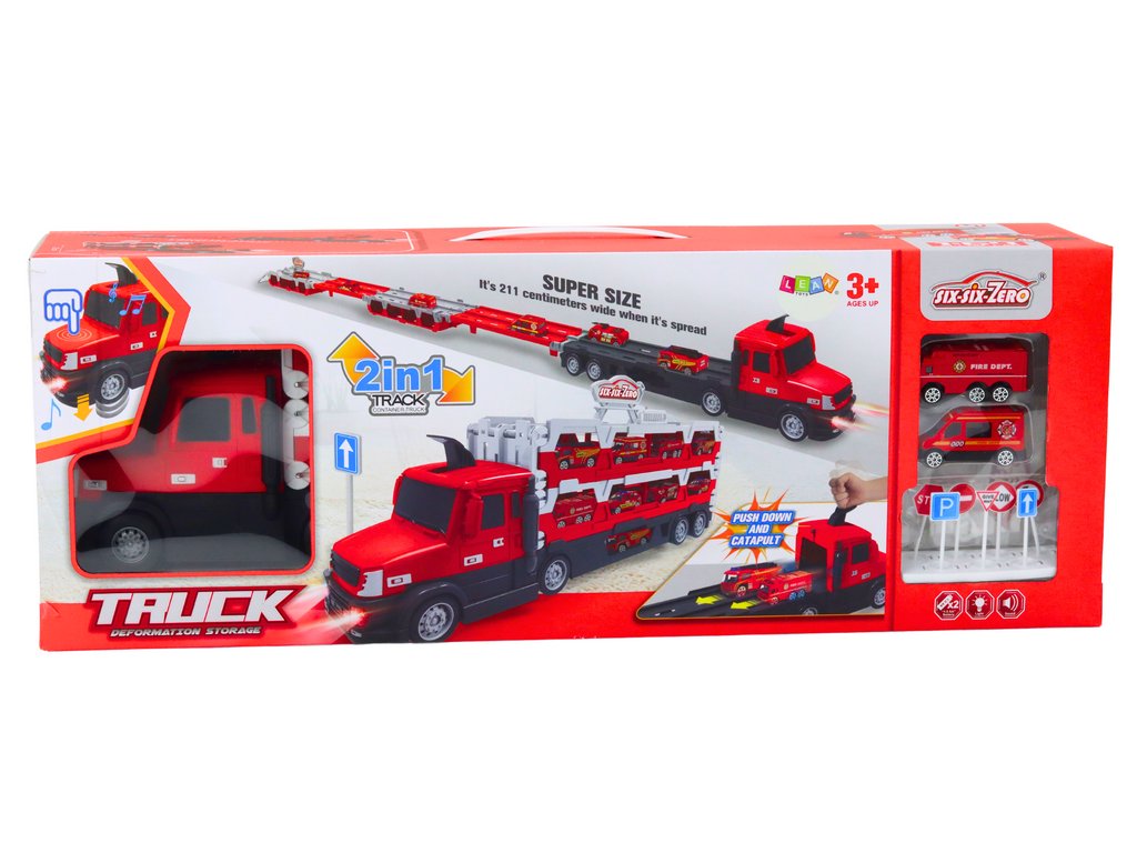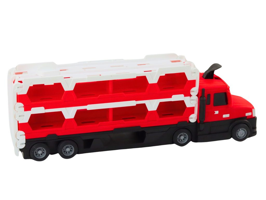 Vă prezentăm o jucărie inovatoare care combină funcția unui camion de trafic și a unei piste de curse într-o singură culoare - într-o culoare roșie dinamică. Această jucărie versatilă oferă ore de distracție captivantă, deoarece vă permite să transportați mașini de jucărie și să organizați curse interesante.