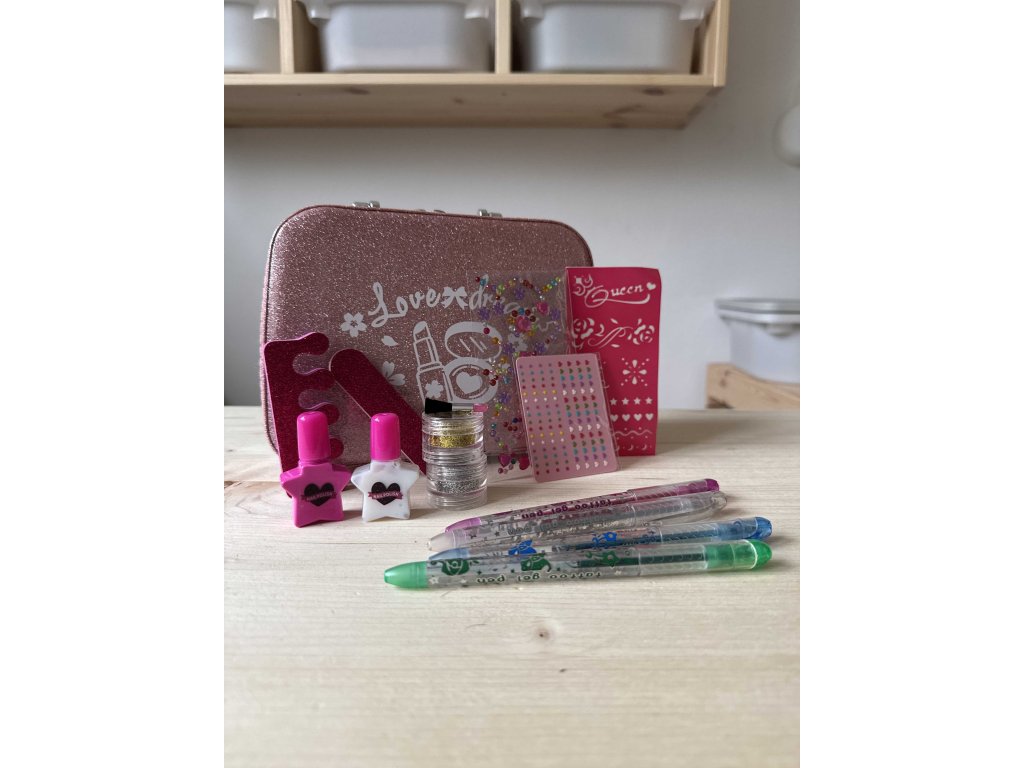 Setul cosmetic pentru copii intr-o cutie eleganta roz este un cadou ideal pentru micile printese care vor sa se simta ca adulti. Acest set conține tot ce aveți nevoie pentru a crea un machiaj și un design frumos de unghii. In carcasa veti gasi diferite tipuri de lacuri de unghii si accesorii pentru unghii. Totul este sigur pentru copii și ușor de curățat.