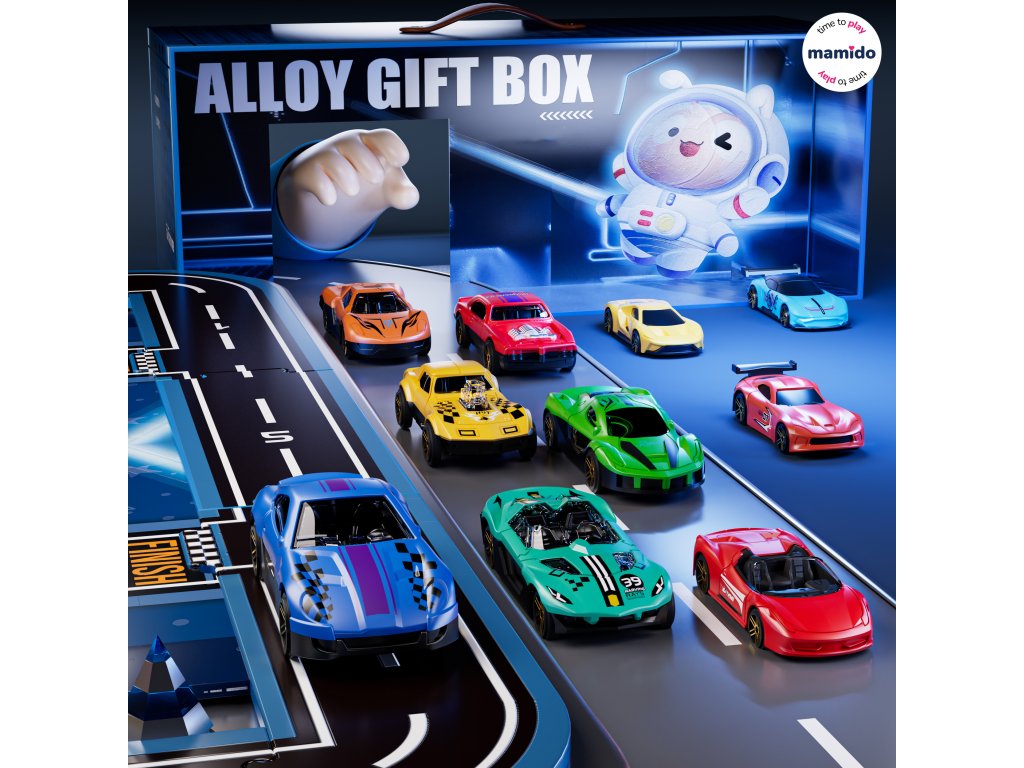 Cutie colecționabilă elegantă plină de mașinuțe de curse colorate pentru iubitorii de viteză. Cutia pliabilă tip valiză servește nu doar pentru depozitarea mașinuțelor, ci și ca pistă de joc – ideală acasă, în călătorii, sau ca un cadou original.