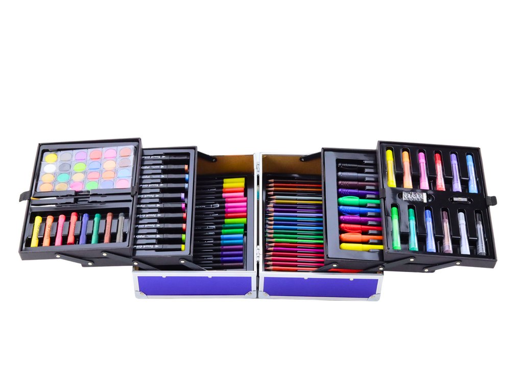Creioane, pasteluri și pasteluri cu ulei, vopsele, două pensule, o gumă de șters, o ascuțitoare și o carte de colorat care vă vor oferi multe ore de distracție creativă. Totul este depozitat într-o cutie pliabilă practică, care nu numai că facilitează depozitarea și transportul, dar încurajează și organizarea instrumentelor de artă după fiecare sesiune de creație.