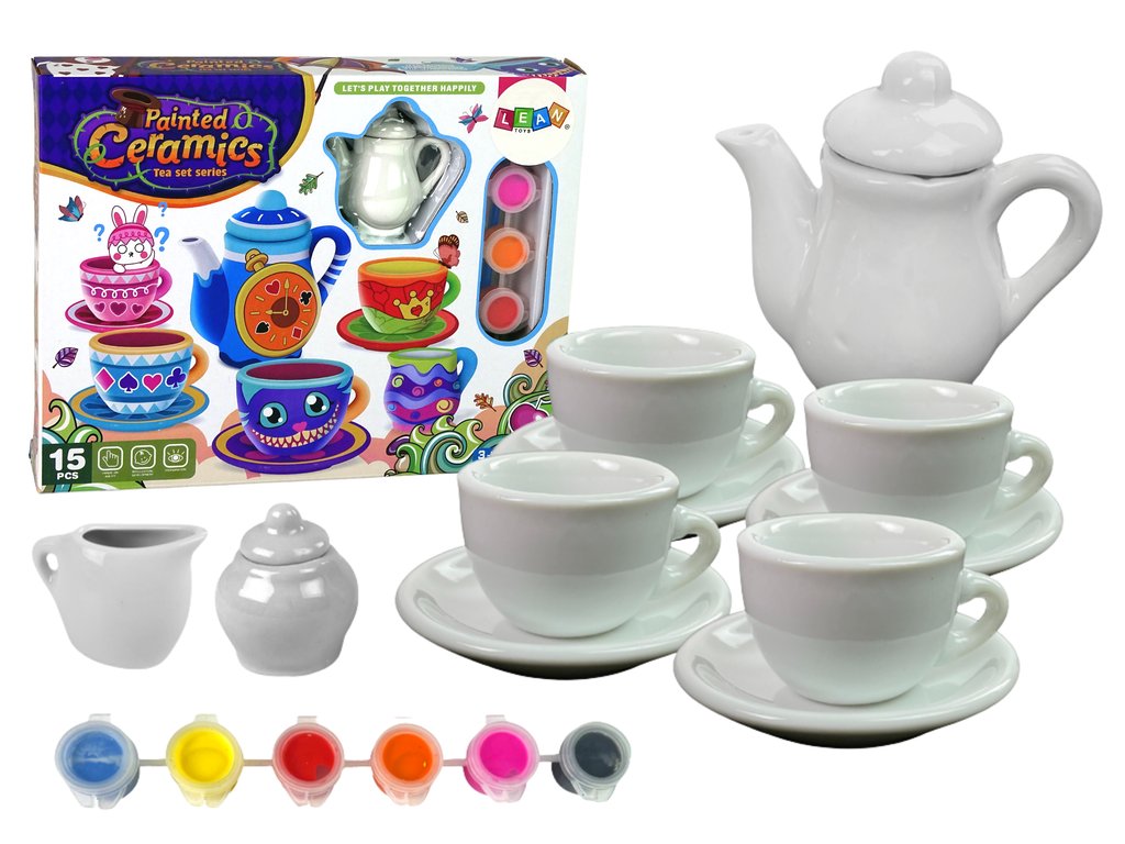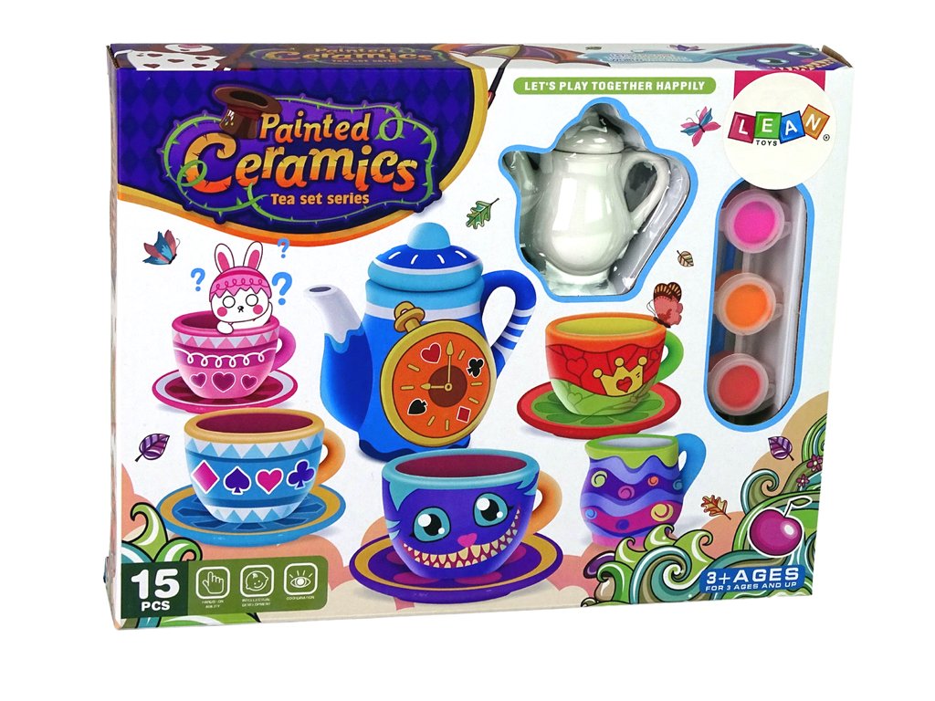 Distracția este în decorarea vaselor de porțelan cu culorile incluse în set. Puteți crea tot felul de modele pe vase și singura limită este imaginația copilului dumneavoastră. Flori, fluturi, animale - fiecare cană poate fi unică.