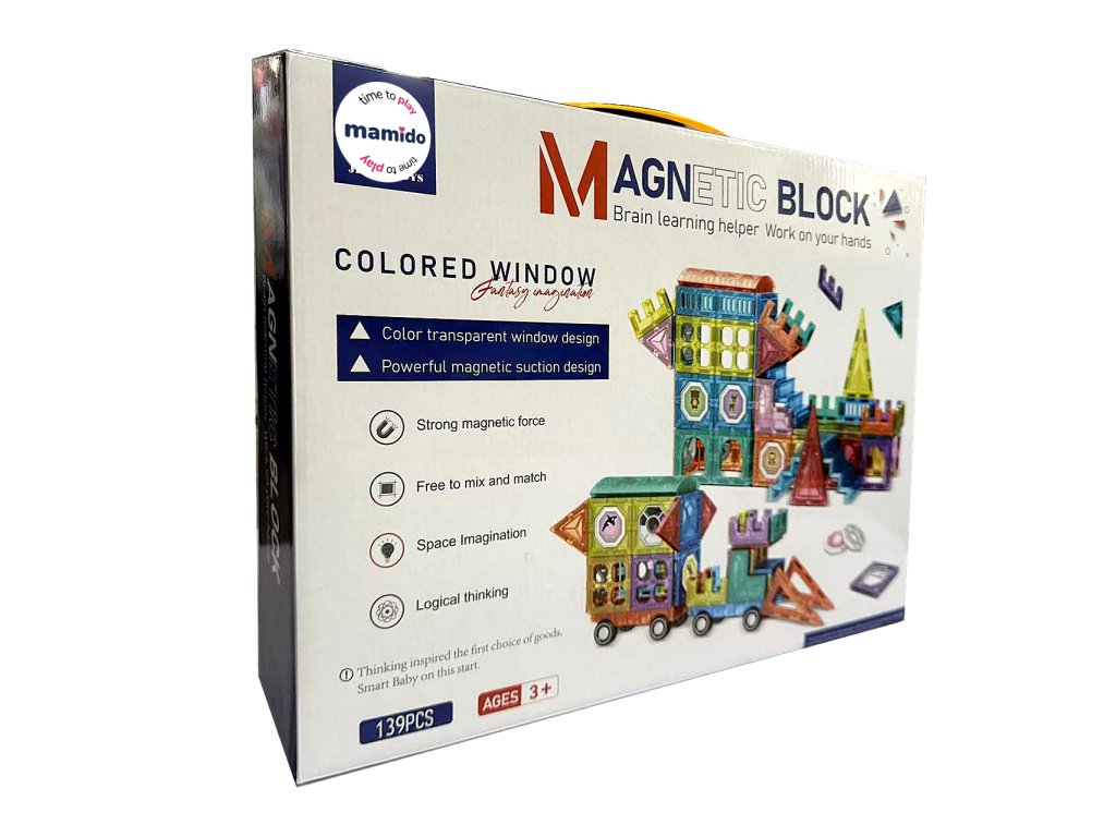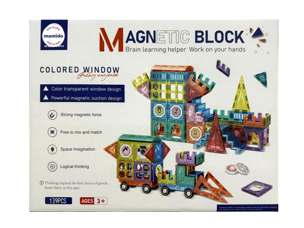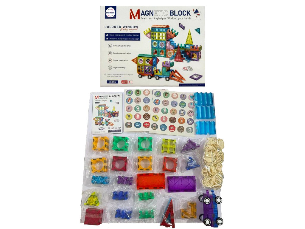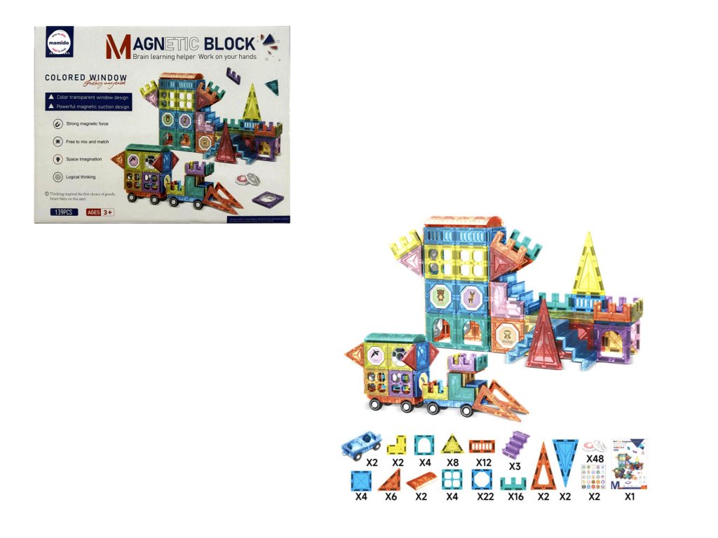Setul conține 139 de piese magnetice de diverse forme – triunghiuri, pătrate, arce, panouri lungi, ferestre decorative și piese speciale. Designul transparent în culori vibrante susține percepția vizuală, iar datorită îmbinării simple, chiar și copiii mai mici se pot descurca. Ideal pentru dezvoltarea creativității, a gândirii logice și a imaginației spațiale.