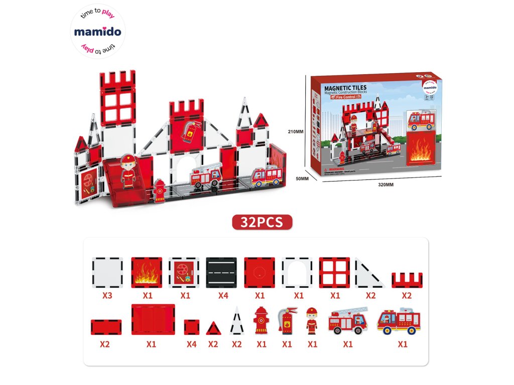 - Include: cuburi magnetice, figurină de pompier, mașinuțe, hidrant, accesorii
