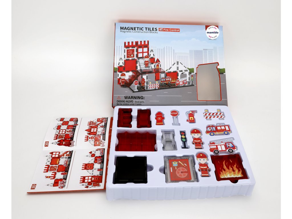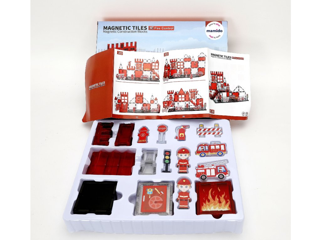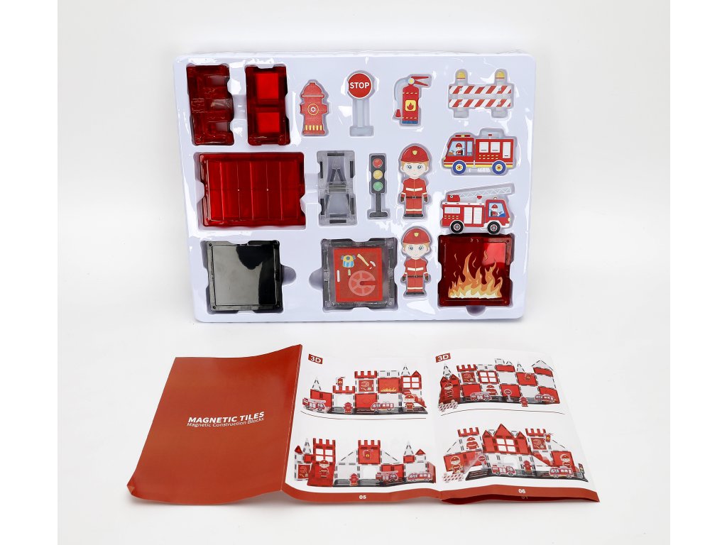 - Include: cuburi magnetice, figurină de pompier, mașinuțe, hidrant, accesorii