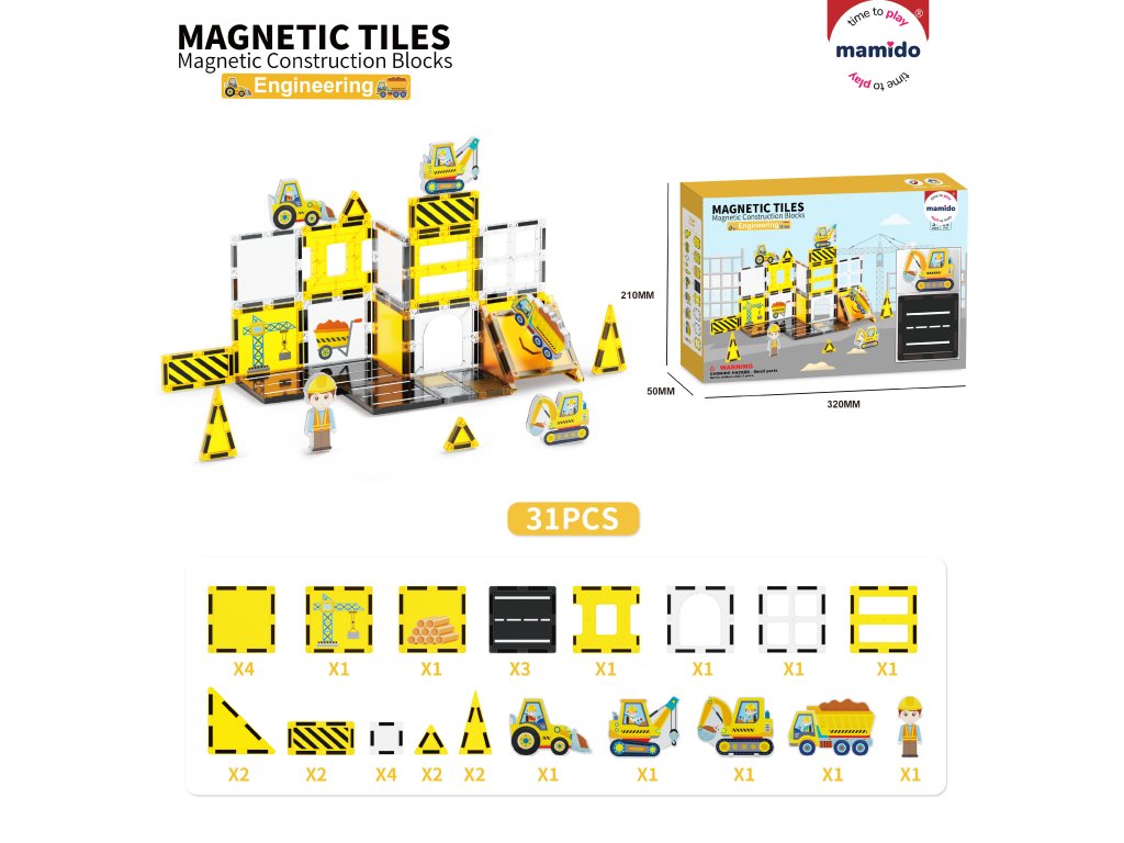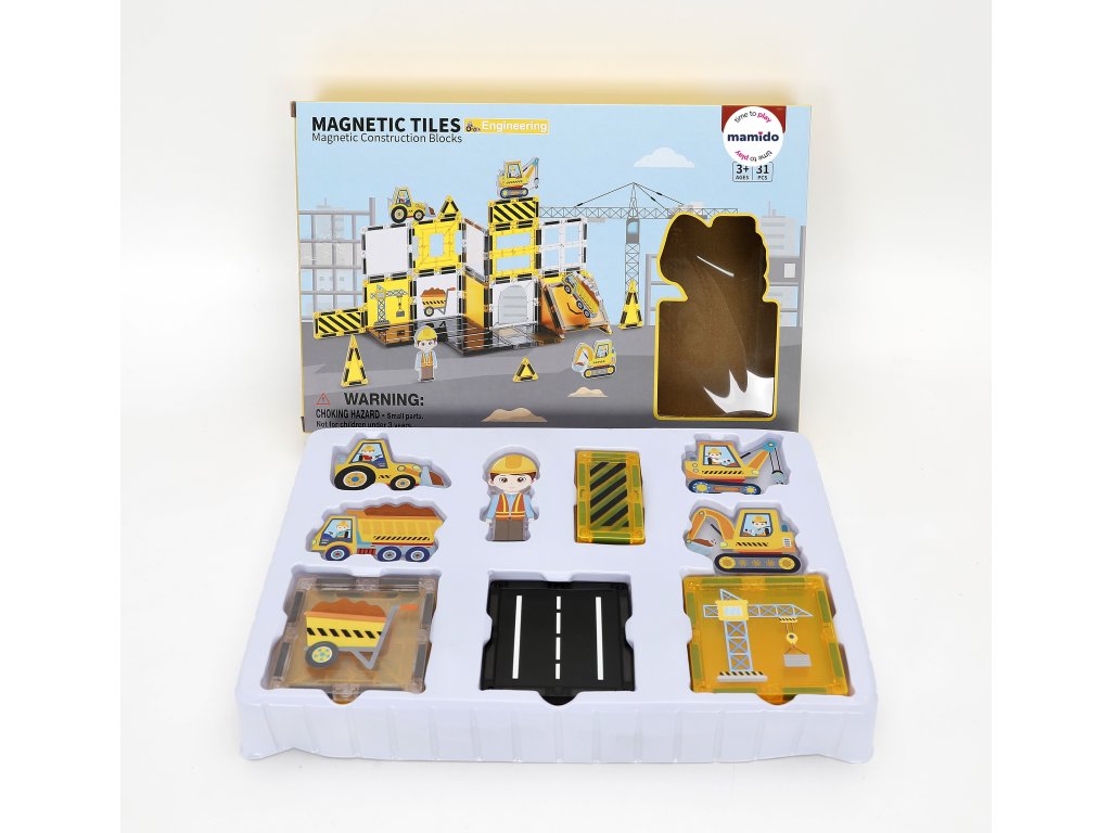 Mergi în lumea transporturilor și a construcțiilor cu un original set de construcție magnetic, care constă din 31 de piese. Copiii își pot construi un întreg oraș cu drumuri, semne, clădiri și vehicule. Piesele magnetice colorate se conectează ușor și permit crearea de combinații infinite, de la structuri simple la scene de trafic elaborate. Setul include, de asemenea, mașinuțe cu șasiu pe roți, indicatoare rutiere, o macara și alte accesorii, datorită cărora jocul capătă o notă realistă.