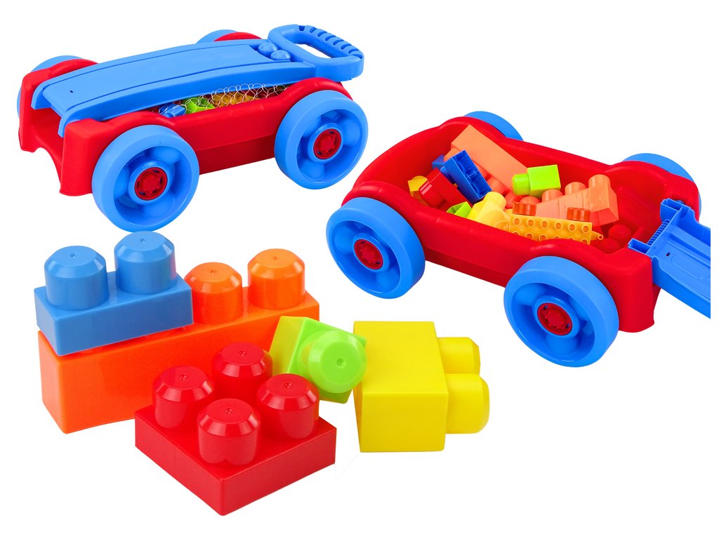 Set de cuburi într-un cărucior pe roți albastru-roșu