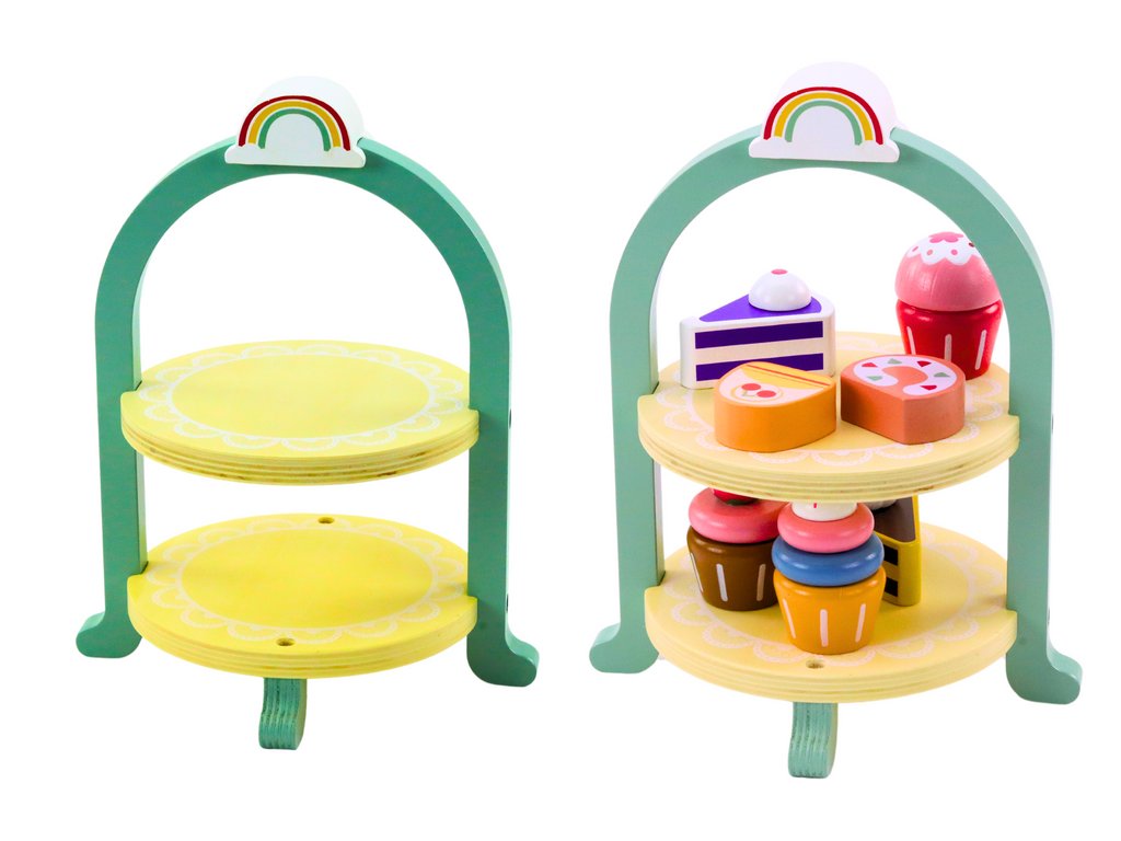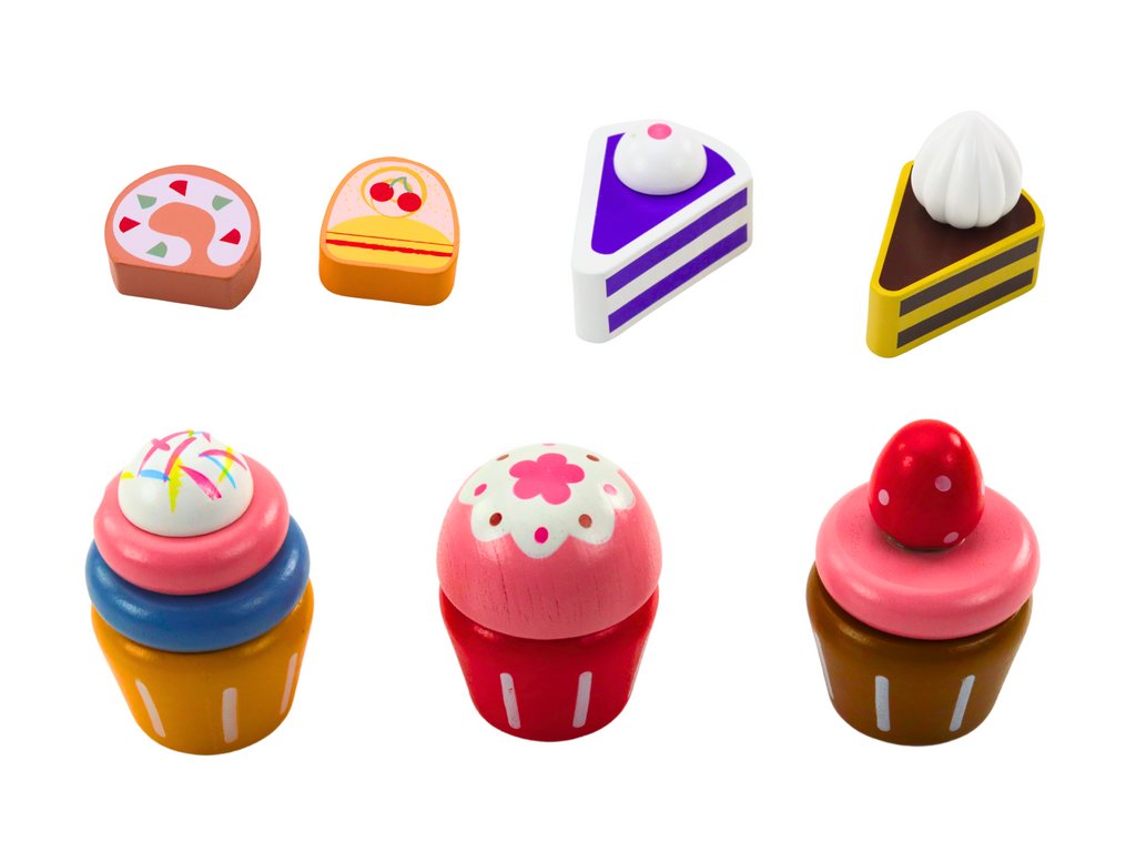 Setul de desert din lemn este o jucărie magică care îi introduce pe copii în lumea dulciurilor și a jocurilor de bucătărie. Include un suport elegant de bomboane cu prăjituri, brioșe și plăcinte lucrate cu precizie, din lemn de calitate. Designul colorat încurajează jocul creativ și dezvoltă imaginația și abilitățile copiilor.