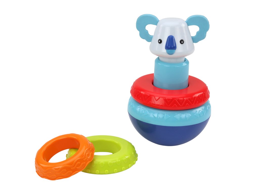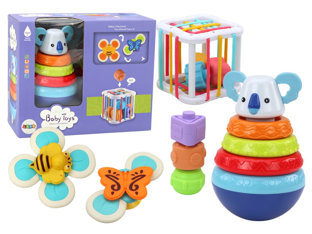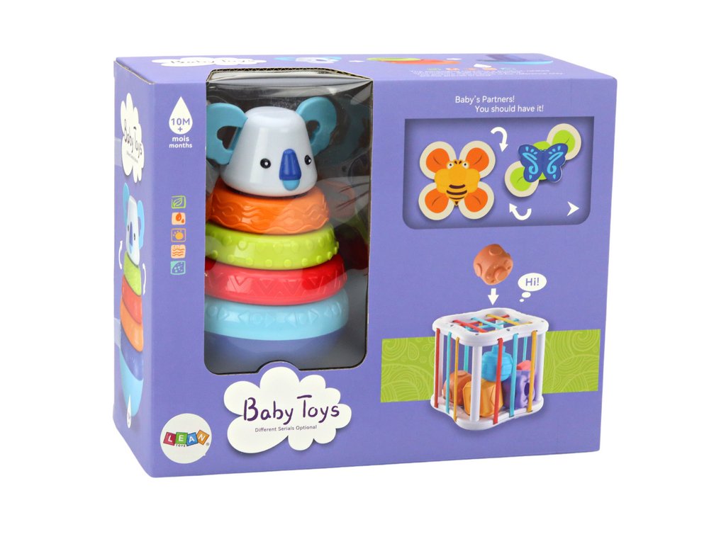 Setul conține trei elemente diferite, fiecare oferind experiențe și provocări unice pentru copil. Turnul de sortare cu inele și koala nu numai că ajută copilul să-și dezvolte abilitățile motorii în așezarea inelelor în locurile potrivite, dar aduce și bucurie datorită mișcării de balansare a koala.