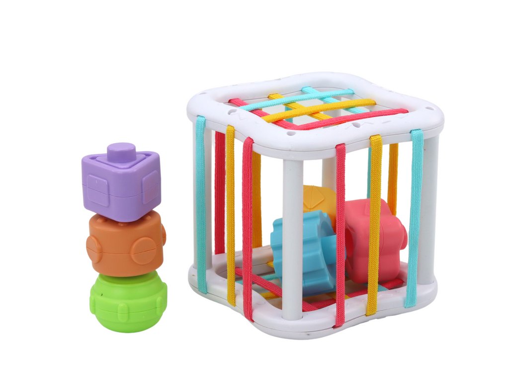 Cubul senzorial conectat prin benzi elastice este o altă jucărie fascinantă care stimulează simțurile copiilor. Împingerea unui cub prin benzile de cauciuc poate părea o sarcină provocatoare la început, dar este o oportunitate excelentă de a dezvolta gândirea, combinarea și rezolvarea creativă a problemelor adaptate la nivelul de dezvoltare al copilului.
