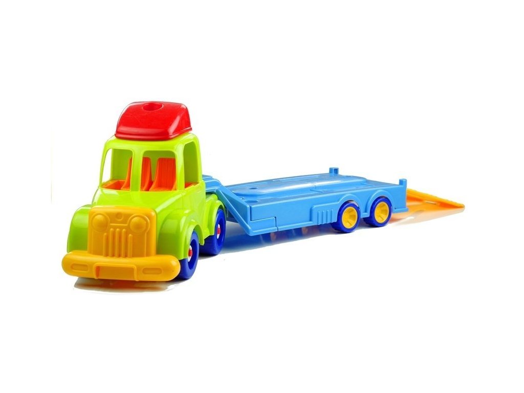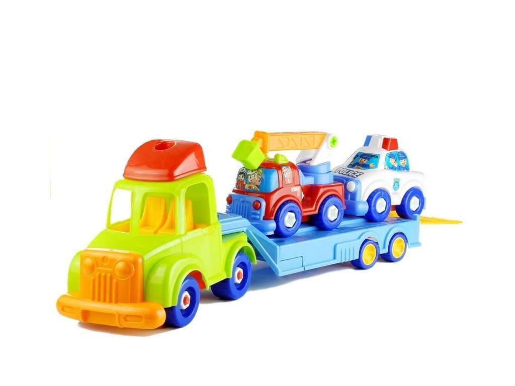 Camionul de remorcare multicolor este format din două părți: o cabină a șoferului cu deschideri în loc de ferestre, în care puteți așeza șoferul și pasagerul, precum și o remorcă basculantă. Mașina de jucărie veselă este așezată pe 4 perechi de roți pivotante, datorită cărora copilul se poate juca cu camionul de tractare în multe moduri diferite . Vehiculul are elemente prinse cu șuruburi mari din plastic pe care copilul le poate deșuruba folosind șurubelnițele din plastic cu vârfuri înlocuibile incluse în set, schimbând forma vehiculului. Două mașini mai mici sunt amplasate pe camionul de remorcare - o mașină de poliție și o mașină de pompieri. Mașina de pompieri are elemente mobile și rotative care dau viață jocului. Vehiculele sunt decorate cu autocolante cu personaje și pasageri, precum și cu inscripții distinctive. Culorile intense, vii, în combinație cu forme rotunde, plăcute, conferă jucăriei un caracter foarte vesel.