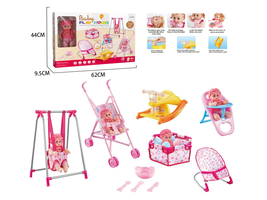 Set de păpuși 7 în 1 păpușă, leagăn, cărucior și țarc