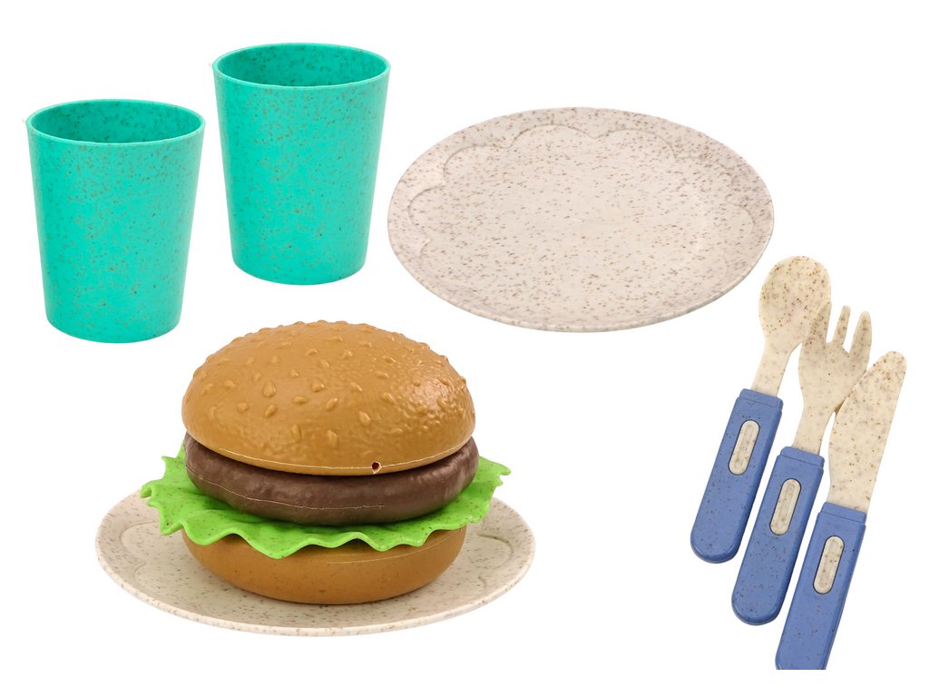 Două farfurii pentru servirea mâncărurilor de jucărie, cum ar fi hamburgerii în miniatură, adaugă realism jocului lor. Cele două căni sunt ideale pentru a servi băuturi și sunt dimensionate pentru copii, făcându-le ușor să țină și să bea. Elementul central al setului este un ulcior cu capac, care permite copiilor să se joace turnând și servind băuturi.