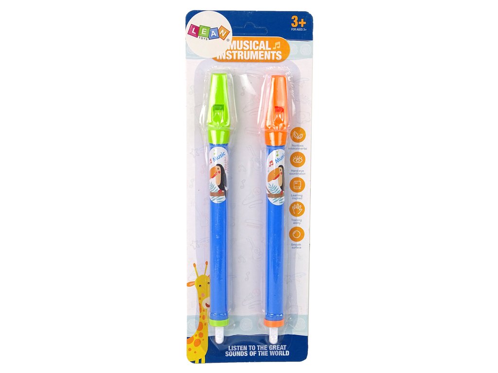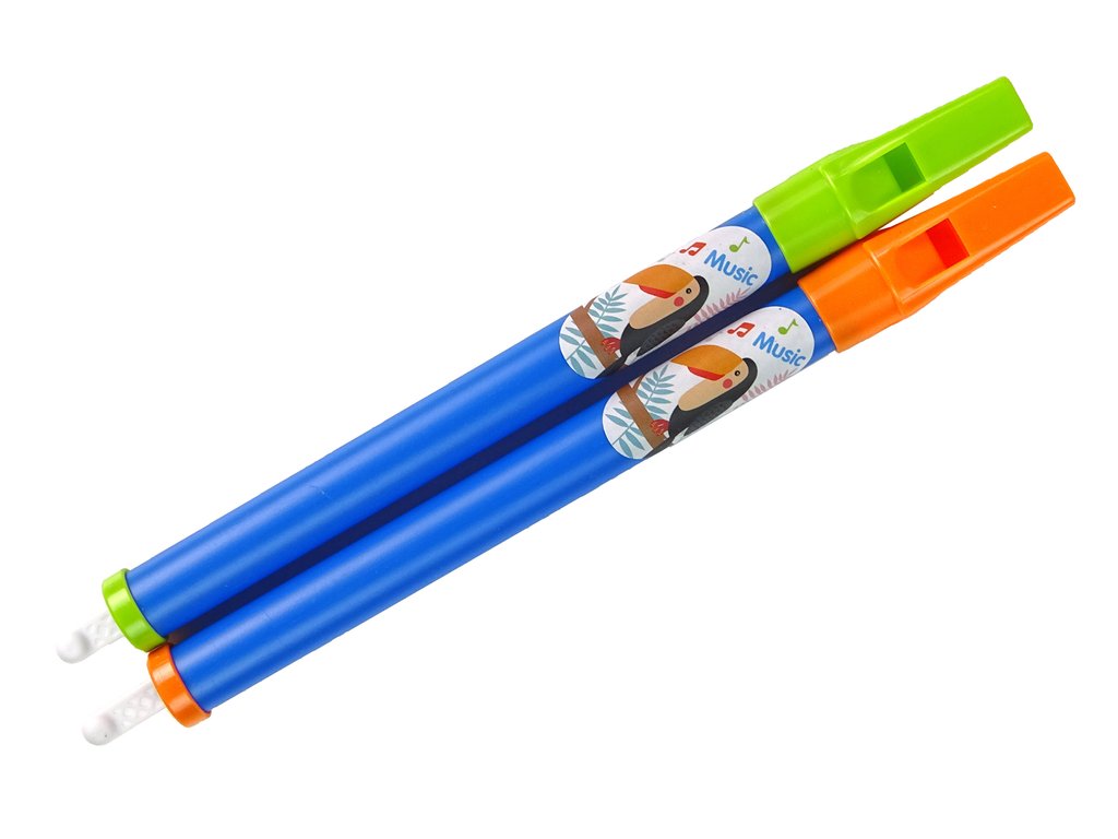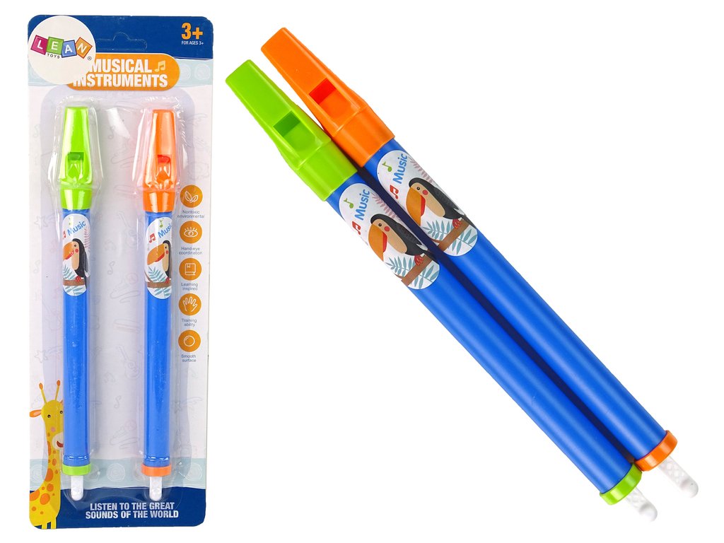 Setul include doua flute cu capete colorate - verde si portocaliu. Sunt pictate în culori frumoase cu motive de animale și natură.
