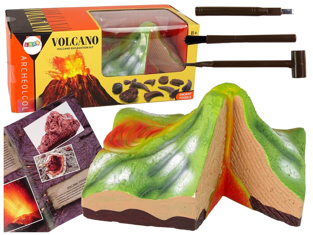 În set vei găsi tot ce ai nevoie pentru a deveni arheolog. Caracteristica principală este un vulcan impresionant de 17 cm x 13 cm x 9 cm, în interiorul căruia sunt ascunse comorile lumii preistorice. Cu ajutorul instrumentelor de săpat și al periei de praf incluse, veți putea descoperi cu precizie artefacte fosilizate ascunse.