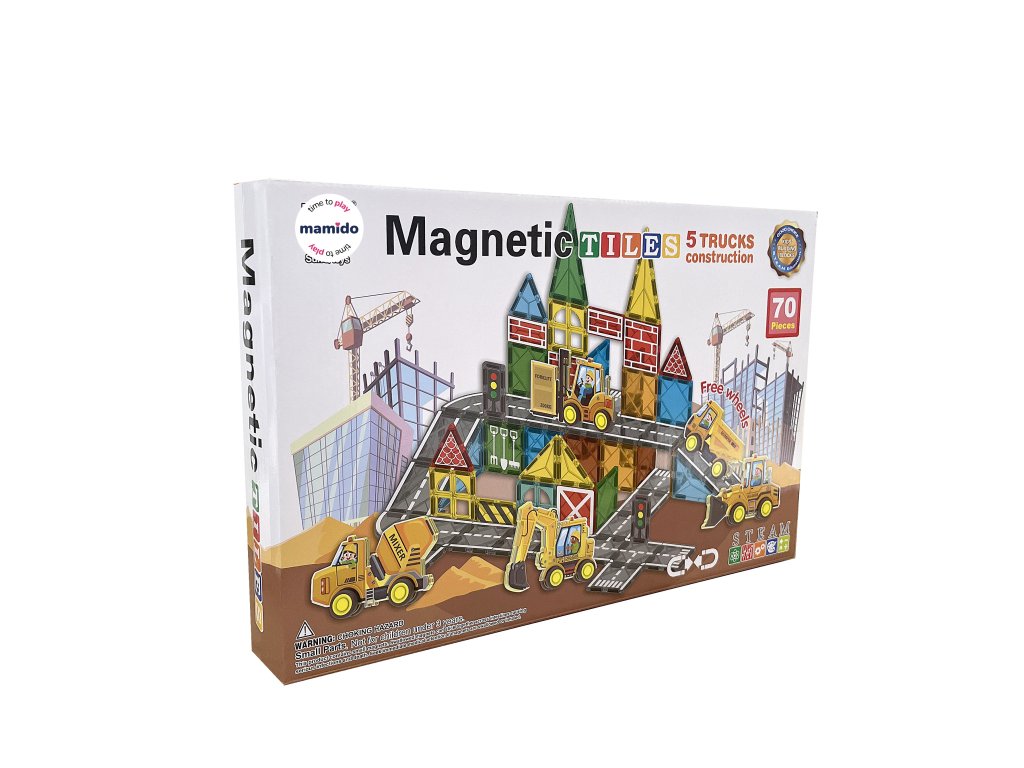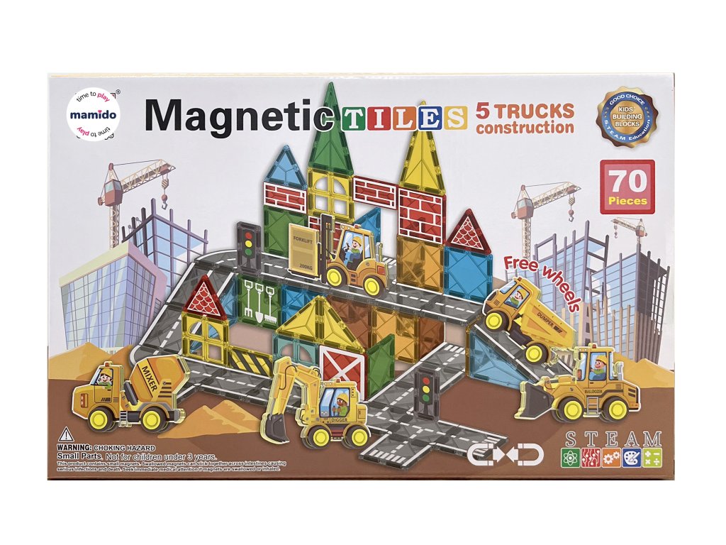 Pornește în lumea transporturilor și a construcțiilor cu un original set de construcție magnetic, format din 70 de piese. Copiii își pot construi un întreg oraș cu drumuri, semne, clădiri și vehicule. Piesele magnetice colorate se conectează ușor și permit crearea de combinații infinite, de la structuri simple la scene de trafic elaborate. Setul include, de asemenea, mașinuțe cu șasiu pe roți, indicatoare rutiere, o macara și alte accesorii, datorită cărora jocul capătă o notă realistă.