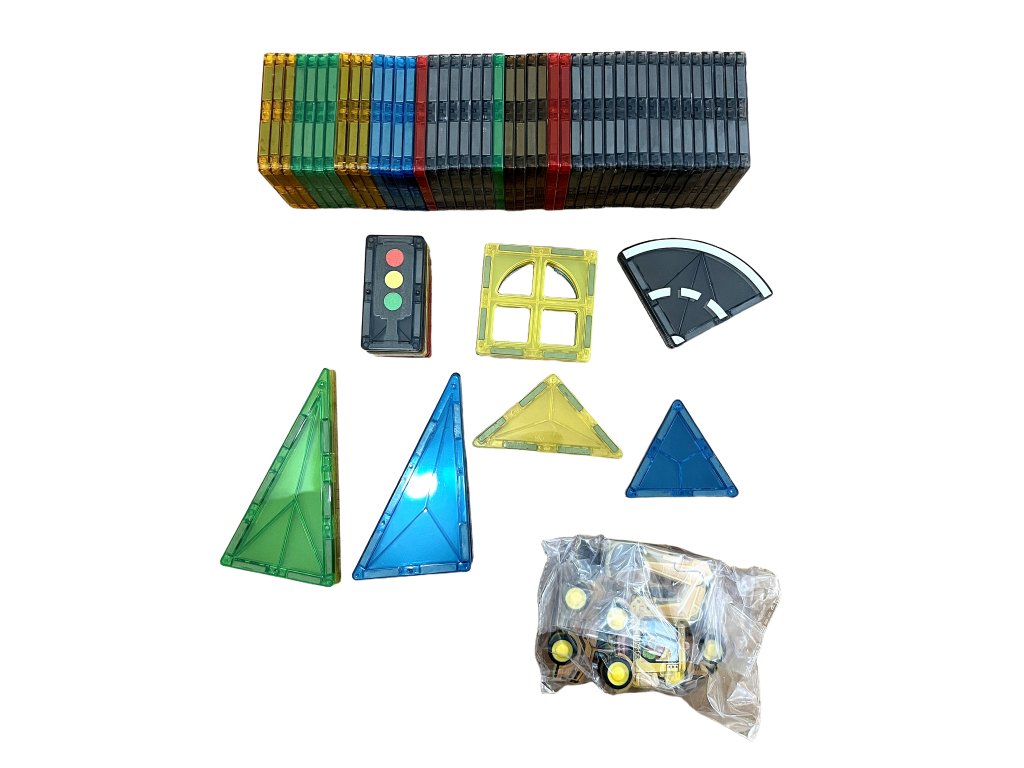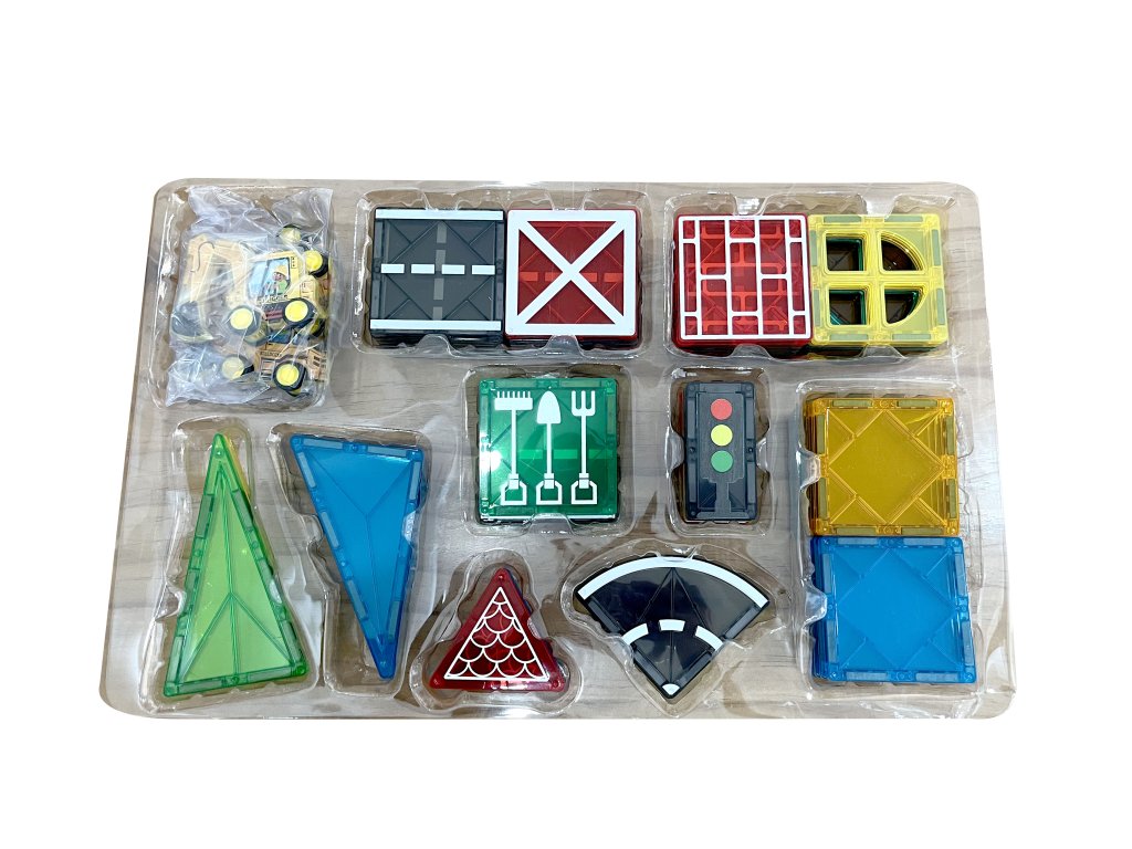 - Include: cuburi magnetice, piese de drum, semne de circulație, mașinuțe și alte accesorii