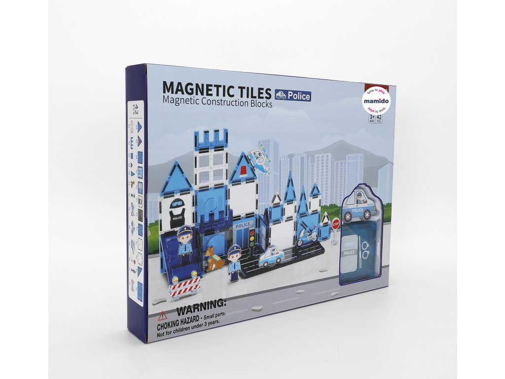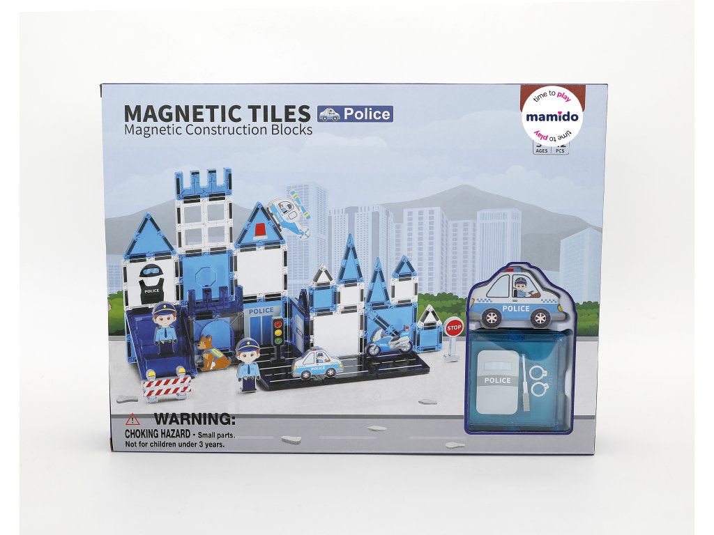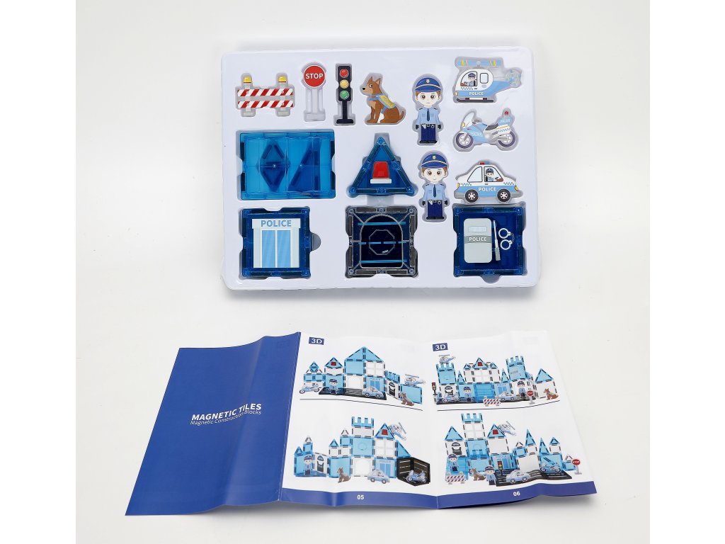 - Conține: cuburi magnetice, o figurină de polițist, mașinuțe, un elicopter și altele