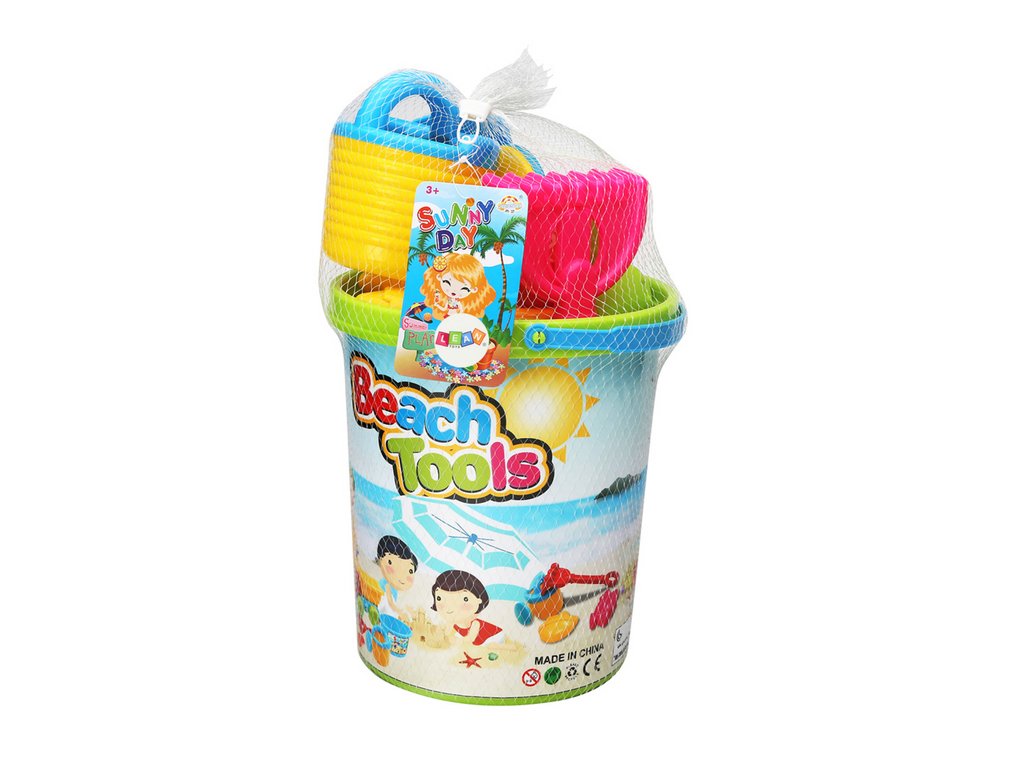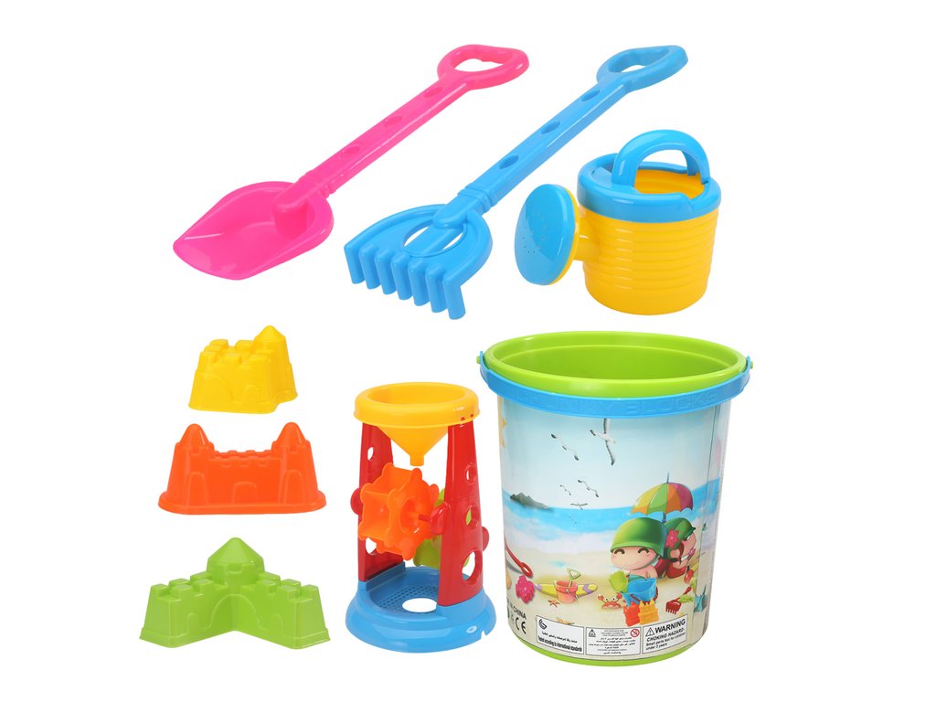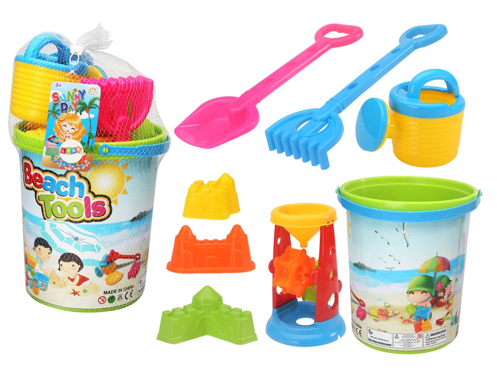 Setul de joaca cu nisip este ideal pentru copiii carora le place sa se joace afara. Elementul central este o găleată mare decorată cu imagini de plajă, care atrage imediat atenția și încurajează jocul. Setul include, de asemenea , o râșniță, lopată, greble, trei matrițe și o cutie de udat, care formează un pachet complet pentru jocul creativ cu nisipul.