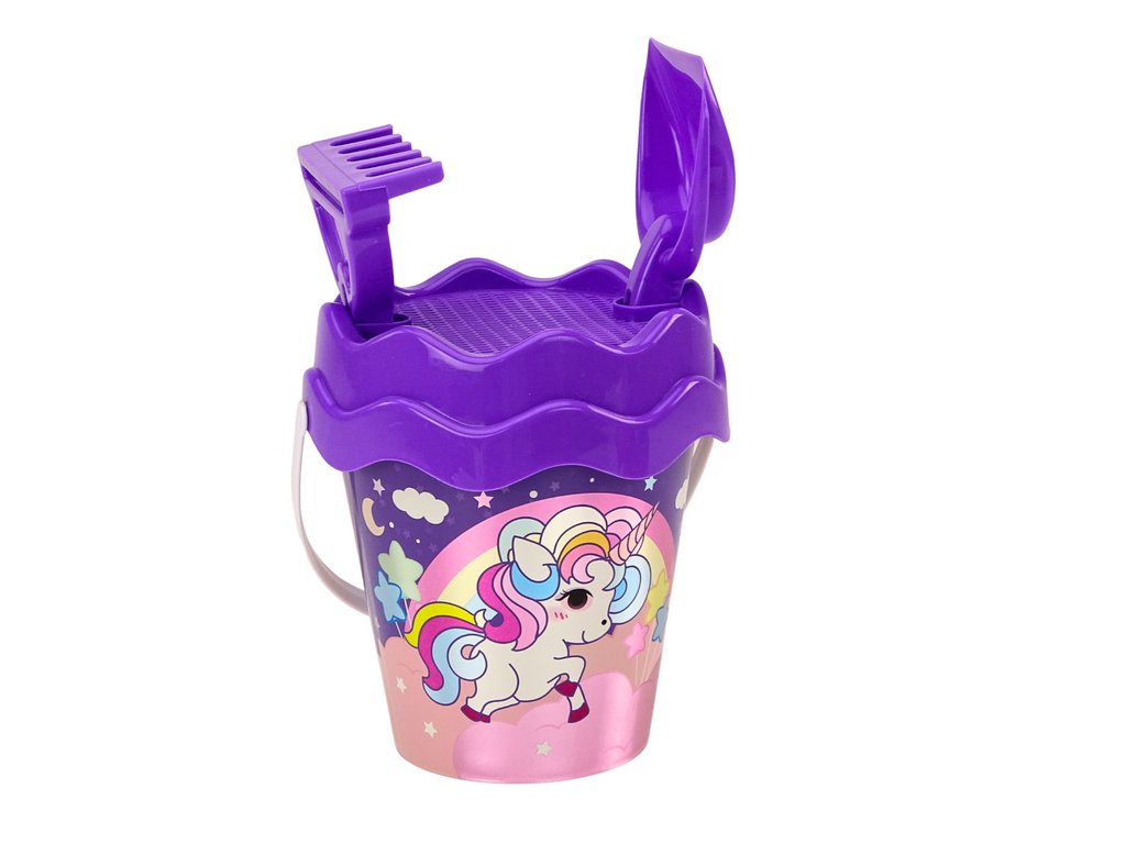 Setul de nisip cu găleată de unicorn este o alegere excelentă pentru copiii cărora le place jocul creativ pe plajă sau cu nisip. Elementul principal al setului este găleata mov, care este decorată cu un motiv drăguț de curcubee și unicorni, dându-i un caracter de basm.