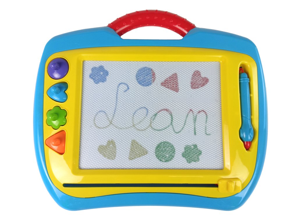 Setul pentru copii este format din două ecrane (mic și mare) pe care poți desena și scrie liber, pixuri magnetice, patru ștampile de forme diferite și un glisor pentru ștergerea imaginilor. Setul este realizat în galben și albastru, iar celălalt avantaj al său este un mâner pentru ținerea tablei. Pixul mare care dispare vă permite să pictați în patru culori, în timp ce cel mic este alb-negru.
