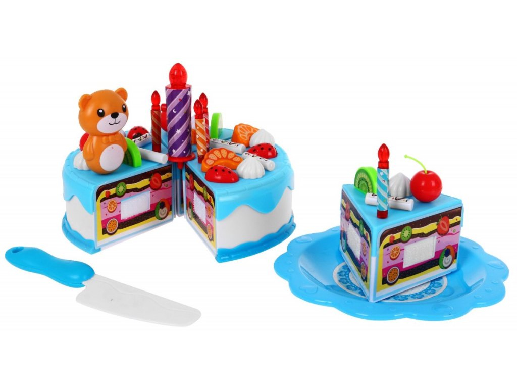 Acest set pentru ziua de naștere pentru copii este format din 80 de elemente, precum fructe, tacâmuri, bomboane și, de asemenea, un tort , care constă din 6 piese legate prin velcro. Avem si varianta de a taia prajitura cu un cutit pregatit in set. Copilul poate decora tortul după propriile idei, ceea ce afectează pozitiv imaginația și abilitățile manuale. Un alt accesoriu inedit este o lumanare electrica care se aprinde in doua culori, pentru a o activa trebuie sa apasati un buton de pe lumanare.