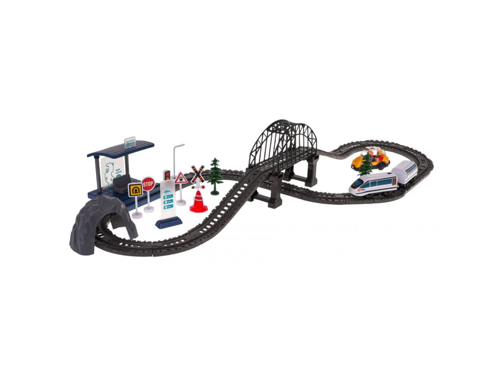 Set cale ferată cu șine și accesorii pentru copii de la 3 ani . Setul este realizat din materiale de înaltă calitate, șenile au zăvoare solide. Setul este format din 76 de elemente: o structură de cale cu un pod, un tunel și o stație, un tren, indicatoare rutiere, precum și o mașină taxi cu pasageri.